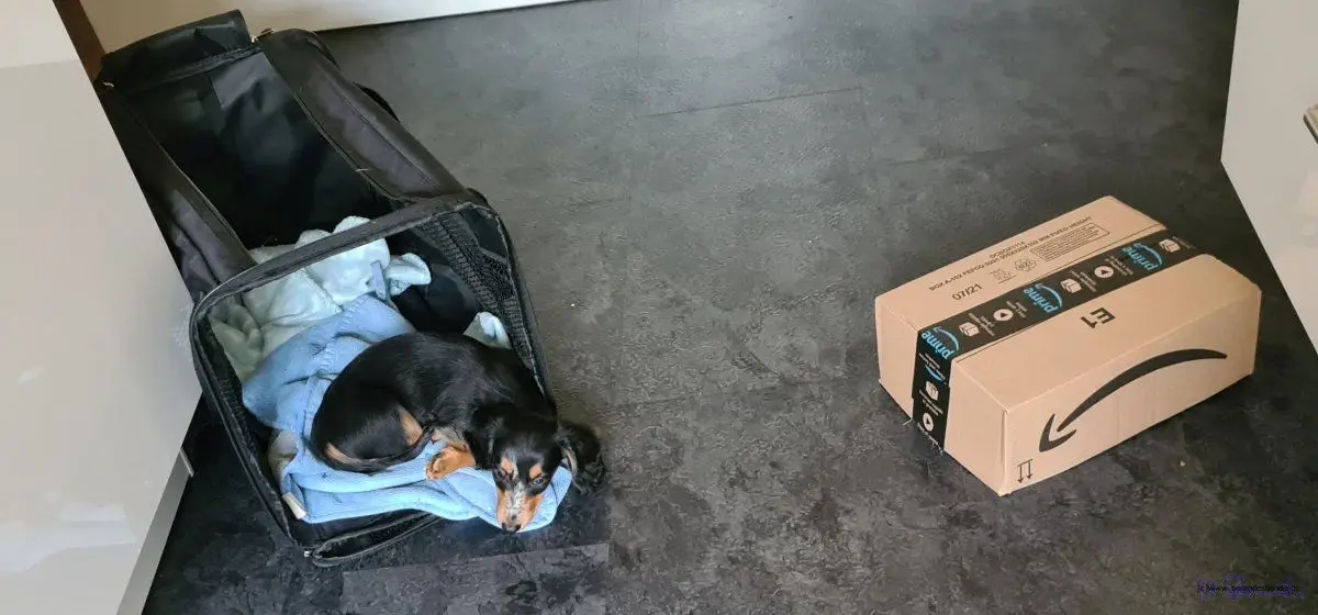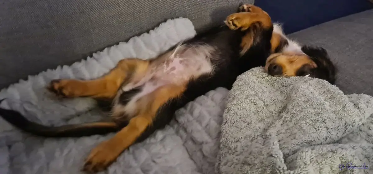 Abends durfte dieser Zwerg dann mit Mama auf der Couch schlafen. DAS DURFTE ICH NOCH NIE! Der Devil hat das auch mal versucht, bis er erwischt wurde - da hat er aber Ärger gekriegt. Ich hab dann lieber auf meinem Platz im Schlafzimmer geschlafen, der Kindergarten geht mich doch nichts an. Herrchen hat auch im Schlafzimmer geschlafen. In der nächsten Nacht hat der Knirps bei Herrchen am Bett in einer Box geschlafen. Der Doofmann muss nachts Pipi machen. Dann rennt Herrchen mit ihm in den Garten. Ich tue so, als ob ich das nicht mitkriege und schlafe weiter.
