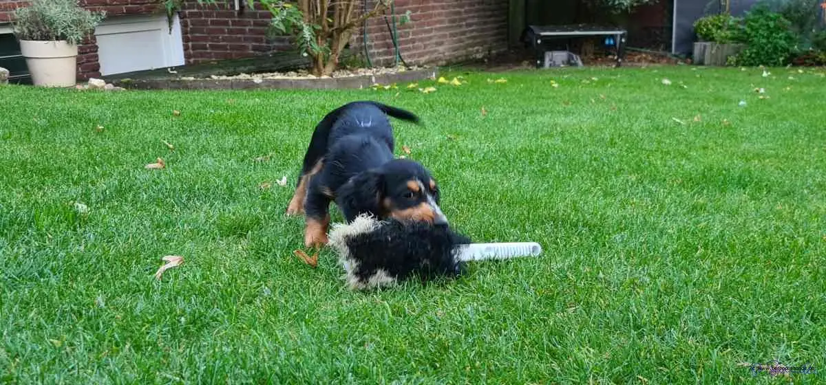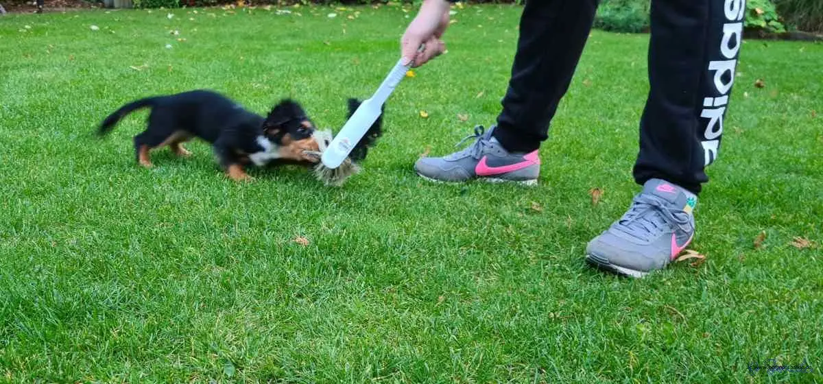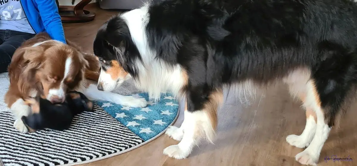 Immer wenn der Schlumpf ankam, bin ich weggelaufen, aber der lief mir immer hinterher. Der Devil hat ihm zum Glück besser gefallen. Da sind ja auch mehr Haare dran, als bei mir. So hatte ich dann doch meine Ruhe. Nach dem Spaziergang sind wir dann nach Hause gefahren und du glaubst es nicht, Frauchen hat diesen Zwerg mit reingenommen. Der durfte aber nicht aus der Küche, Herrchen hat ein Brett in die Tür gelegt, dass der Pimpf nicht raus konnte. Ich hätte rein gekonnt, aber das wollte ich ja gar nicht. Zuerst hab ich gedacht, ich ignoriere den einfach, aber der ist nicht mehr gegangen, genau wie damals bei Devil. Der Devil ist ja zum Glück groß geworden und kann sich mittlerweile ja auch halbwegs benehmen. Aber dieser Wicht wird nie ein richtiger Aussie.