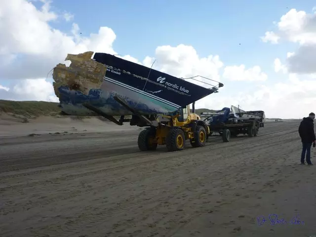 An einem stürmischen Tag waren große Laster und Bagger am Strand. Die haben ein ziemlich kaputtes Segelschiff abgeholt, das da rumlag. Es war in der Mitte durchgebrochen. Herrchen hat gesagt, dass die Menschen von dem Segelboot zum Glück gerettet worden sind.