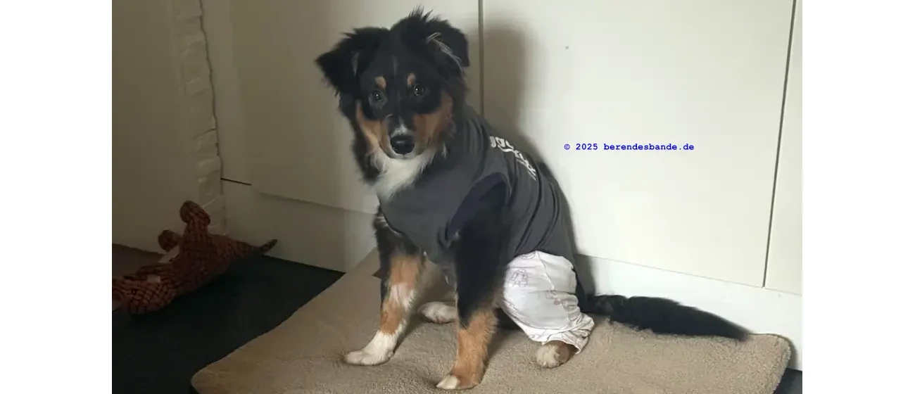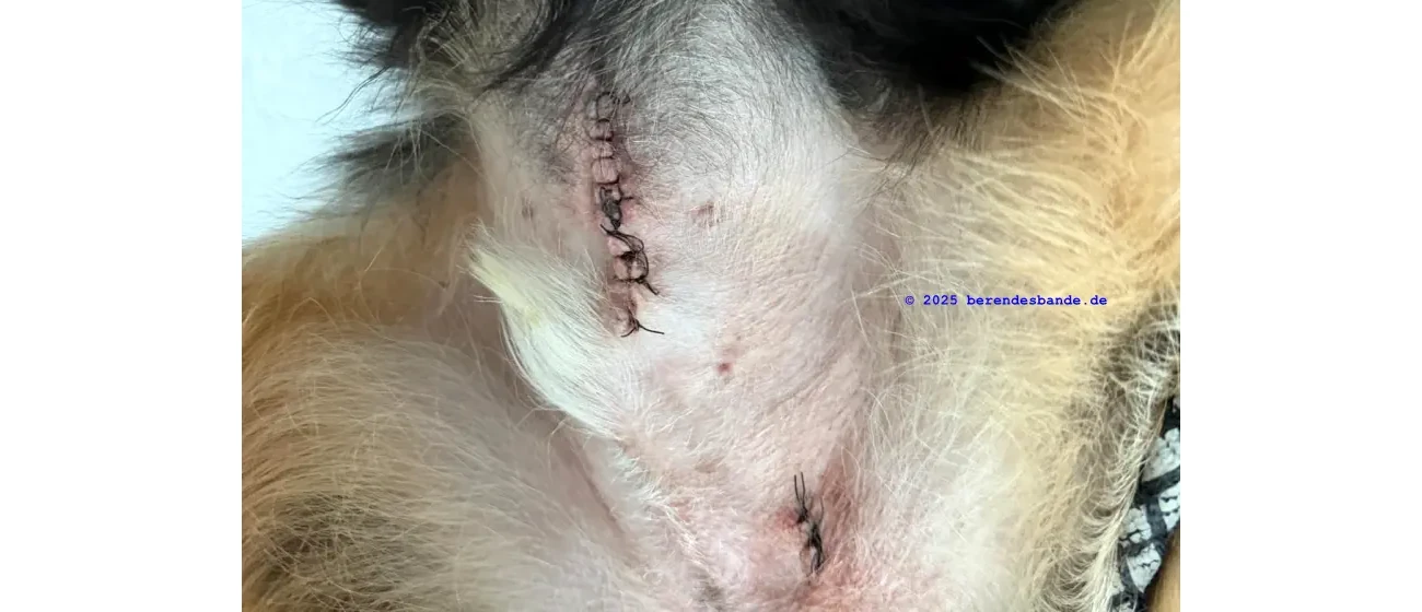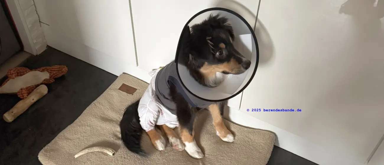 - Nach der OP muss der Hund einen Body und/oder Kragen tragen und darf 10 Tage lang nicht toben.