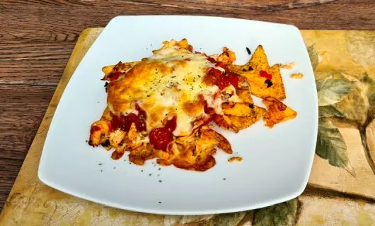 Den Backofen auf 140 Grad Umluft vorheizen. Das Fleisch in eine Auflaufform geben, mit der Sauce übergießen. Dann die Auflaufform mit Alufolie abdecken und für 100 Minuten in den Backofen geben. Dann die Alufolie entfernen und weiter 20 Minuten garen. Die Form aus dem Ofen nehmen und den Ofen auf 160 Grad vorheizen. Das Fleisch aus der Sauce nehmen und mit zwei Gabeln in feine Streifen reißen. Ein Backpapier auf ein Backblech legen. Die Nachos in vier Teilen kreisförmig auf das Backpapier geben (ca. 10-15 cm Durchmesser). Sie dürfen auch übereinander geschichtet werden. Dann das Fleisch auf den Nachokreisen verteilen. Die Sauce aus der Auflaufform darüber verteilen und mit Mozzarella bedecken. Das Blech zum Überbacken in den Backofen geben, bis der Käse gut verschmolzen ist. Die Nachopizzas vorsichtig mit zwei Pfannenhebern vom Backpapier lösen und auf die Teller geben. Mit eine Prise Oregano verfeinern. Mit je zwei Esslöffel Sauercreme garnieren.