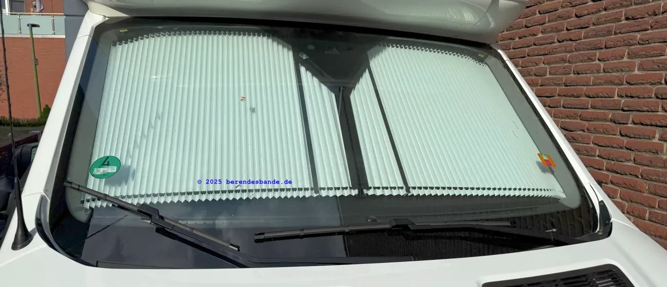 Dem versierten Heimwerker dürfte die Montage gelingen, zudem Remis auf YouTube ein Einbauvideo veröffentlicht hat. Zeitlich sollte man ein bis zwei Stunden einplanen. Eine kleine Hürde war die Montage des unteren Führungsrohr. Angeblich soll die linke Seite gelb markiert sein. Doch beide Teilstücke waren unmarkiert und identisch. Den Platz für das Lager, das in der Mitte des Armaturenbrettes angebracht wird, muss empirisch gefunden werden, bevor man die beiden Löcher zur Befestigung bohrt. Dazu sollte man das Plissee schließen, um sicherstellen, dass der Magnetverschluss in der Mitte auch greift. Letztendlich wurde der Umbau erfolgreich umgesetzt. Die Handhabung ist deutlich besser als mit dem Dometic Rollo. Eine Blende für das Führungsrohr an der Unterseite wäre wünschenswert, da zwischen Armaturenbrett und Plissee ein Spalt viel Licht durchlässt. Der Preis für das Plissee ist mit 500 € ziemlich üppig. Unsere Dashcam musste weichen. Das Remisfront liegt näher an der Frontscheibe als das Dometic Rollo. Die Dashcam hat ihren neuen Platz auf dem völlig nutzlosen Innenspiegel gefunden 😀.