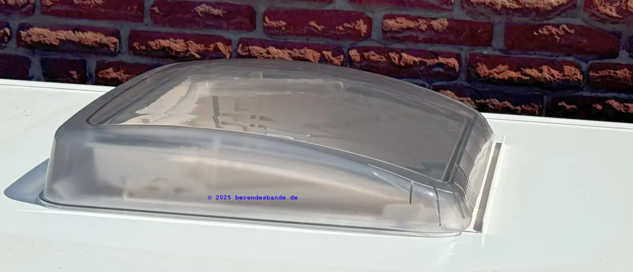 Als weitere Verbesserung wurde das Dachfenster im Bad ausgetauscht. Die Dachhaube in der Dusche wurde durch ein Mini Heki Dachfenster ersetzt. Auch diese Montage ist relativ einfach durchzuführen. Zuerst löst man die beiden sichtbaren Schrauben am Insektenrollo. Dann wird die Rollo-Kassette mit Kraft nach unten gezogen und entfernt. Als nächstes entfernt man die vier Schrauben samt der Klammern, mit denen die Haube gehalten wird. Weiter geht es von außen. Mit einem Messer oder Spachtel wird vorsichtig das Dichtungsmaterial zwischen Dachhaube und Dach durchschnitten. Danach lässt sich die Dachhaube einfach aus der Öffnung heben. Die alte Dichtungsmasse muss entfernt werden. Das funktioniert ganz gut mit Pinselreiniger.