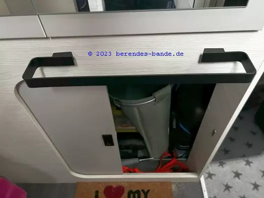 Die Schrankleuchte wurde gegen eine leistungsfähigere, wiederaufladbare Lampe ersetzt. Diese ist mit Magnetpads befestigt, so dass das Aufladen kein Problem ist. Sie hat ebenfalls einen Bewegungsmelder, so dass da Licht beim Öffnen der Schranktür automatisch eingeschaltet wird. Ein weiterer Vorteil ist ein Ein-Ausschalter, der der Challengerleuchte fehlte. Ich habe diese Leuchte im Doppelpack bei Amazon für etwa 20 € gekauft. Die zweite Leuchte habe ich in der Garage, rechts neben der Luke angebracht. Nun tappt man nicht mehr im Dunkeln, wenn man von der Luke her in die Garage greift.