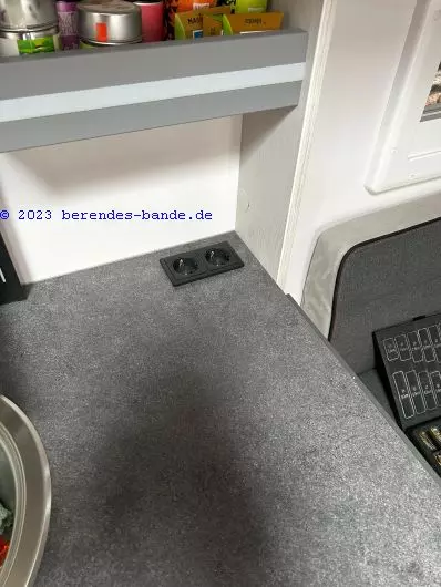 Beginnen wir mit dem Einbau von zwei Steckdosen im Bereich der Küche. Auf der rechten Seite unterhalb des Regals habe ich in der Arbeitsplatte eine Doppelsteckdose eingebaut. Wir platzieren in diesem Bereich gern Wasserkocher und Kaffeemaschine. Der Wasserkocher kann auch während der Fahrt an seinem Platz verbleiben, die Kaffeemaschine verstauen wir in dem offenen Stauraum unter der linken Sitzbank. Die im Fahrzeug verwendete Schalterserie heißt Inprojal Serie 20000. Man bekommt sie Travel-Lighting. Ich habe einen Doppelrahmen, zwei Steckdosen mit Zentralplatte und zwei Berührungsschutzdosen zu diesem Zweck bestellt. Die Steckdosen haben dann keinen Klappdeckel. Die Löcher in der Arbeitsplatte habe ich mit einer 50 mm Lochsäge gebohrt. Der Durchmesser der Schutzdose ist 43,5 mm, ich hatte aber keine kleiner Bohrkrone. Da die Schutzdose an der Steckdose einrastet und immer noch genügend Platz verbleibt, um die vier Schrauben zu befestigen, ist die 50 mm Bohrung kein Problem. Die Spannung habe ich von der Steckdose links am Herd abgezweigt. Dazu habe ich eine Kabeldurchführung durch den mittleren Schrank bohren müssen. Im rechten Schrank habe ich das Kabel durch einen Kabelkanal nach hinten geführt.
