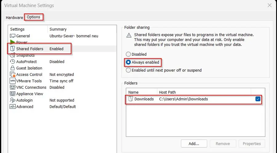 Zuerst richtet man im VMware Player in den Einstellungen des virtuellen Servers das gemeinsame Laufwerk ein, also ein Verzeichnis des Host Rechners, auf den die VM zugreifen können soll. Bei mir ist das der Downloads-Ordner.