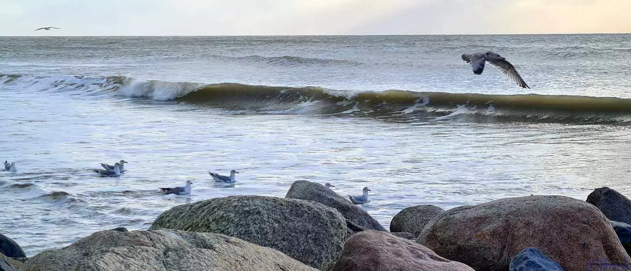 Dann kam ganz doller Wind und es wurde richtig kalt. Mir ja nicht, ich hab ja ein gutes Fell, aber die Menschen haben gefroren. Beim Spaziergang mussten die sich sogar Socken über die Hände ziehen, so kalt war es. Es gab auch ein bisschen Schnee. Aber über Tag kam die Sonne und es war nur noch ein bisschen kalt. Wir gehen jeden Tag große Runden spazieren über den Strand. Heute waren alles lustige Knäule am Strand. Frauchen hat die, wie einen Fußball, weg geschossen. Aber ich hab die dann gefangen und zerfleddert. Das war toll.