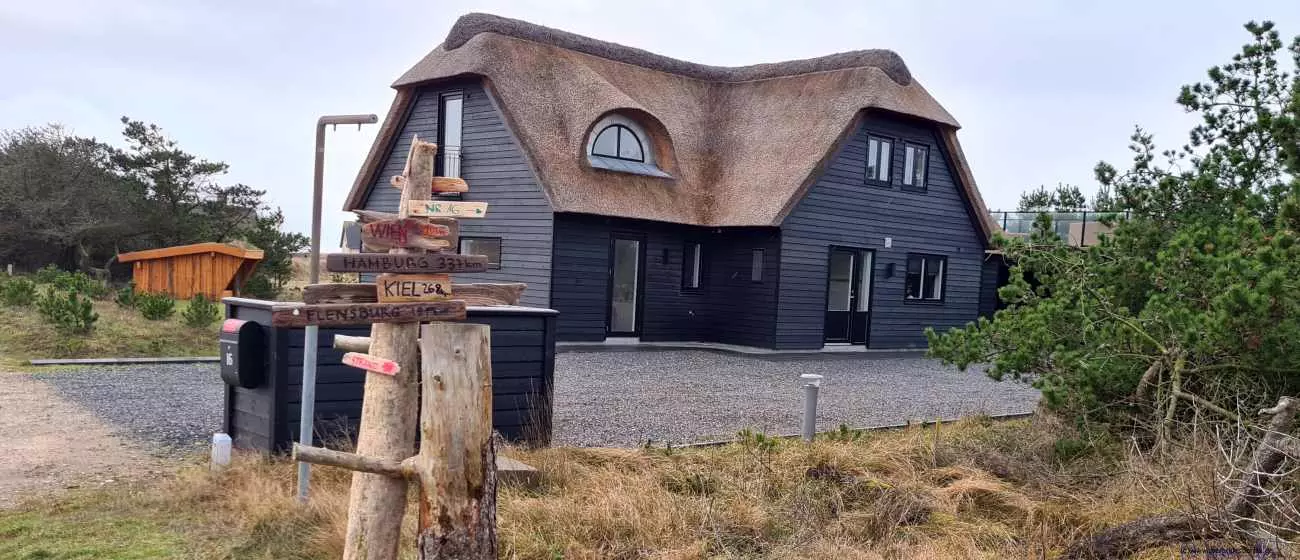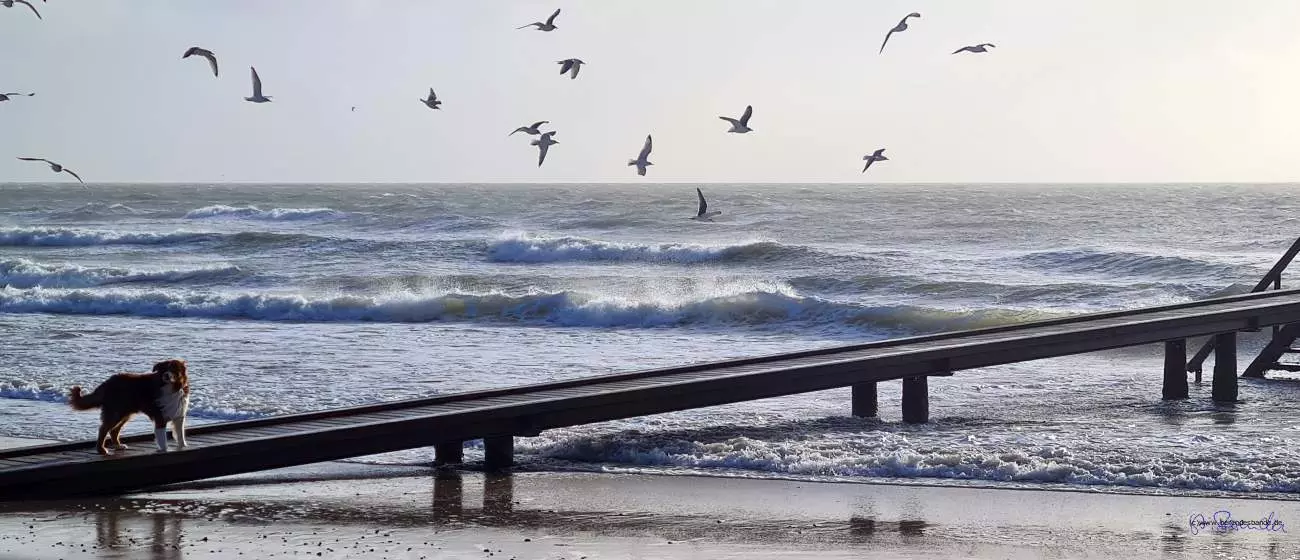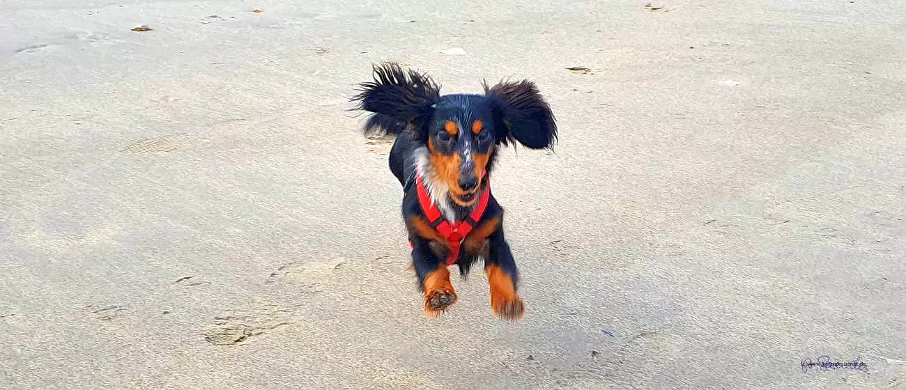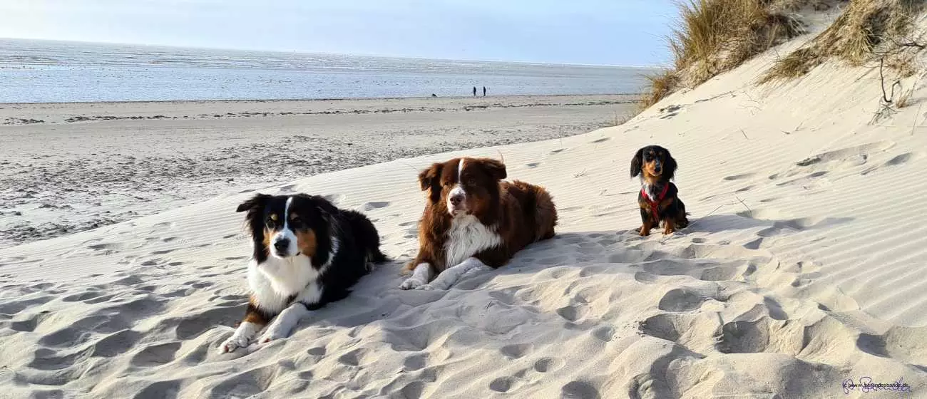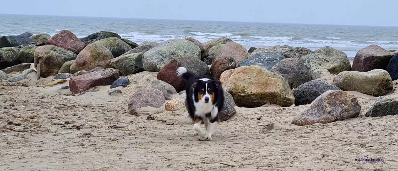 Das Haus ist toll, hat große Fenster bis auf den Boden, da kann man super raus gucken. Und eine Treppe, die kann man immer rauf und runter sprinten. Das macht Spaß. Aber meistens sind alle unten, nur zum Schlafen gehen wir nach oben. Am nächsten Tag sind wir ganz weit spazieren gegangen. Da gibt es nämlich einen Strand, ganz breit und ein Meer mit großen Wellen. Ich glaube das heißt Australien - oder Dänemark, ich weiß nicht so genau. Jedenfalls konnten wir am Strand laufen und buddeln, das mach ich ja besonders gerne. Frauchen hat alles mögliche eingesteckt, Stöcke und Muscheln und so. Das soll alles in den Garten an den Teich, das macht die immer, wenn wir am Strand laufen. Und der doofe Snickers bellt immer, der findet Strand blöd.