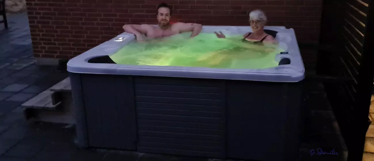 Draußen vor dem Haus steht eine große Badewanne, also eine richtig große, nicht wie zu Hause wo nur einer reinpasst. Da passen alle aus dem Rudel zusammen rein, also die Menschen, wir Hunde müssen draußen bleiben. Dann blubbert die Badewanne immer und das Wasser sprudelt. Die Menschen finden das toll, ich fand das ein bisschen gruselig - aber nur ein bisschen.