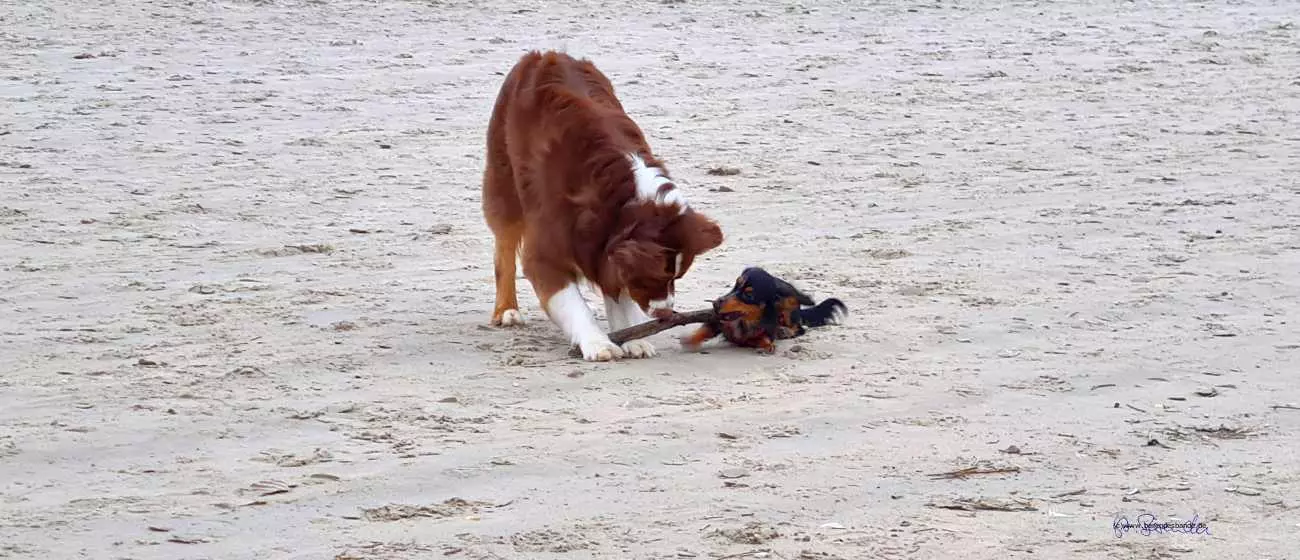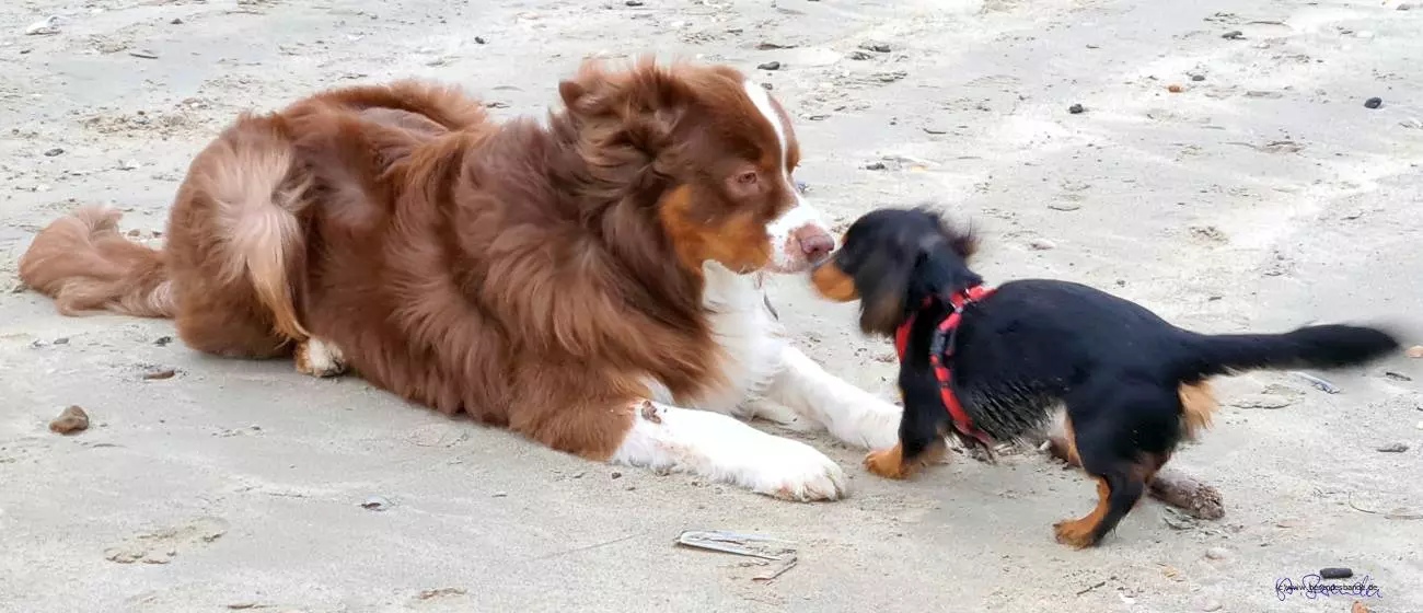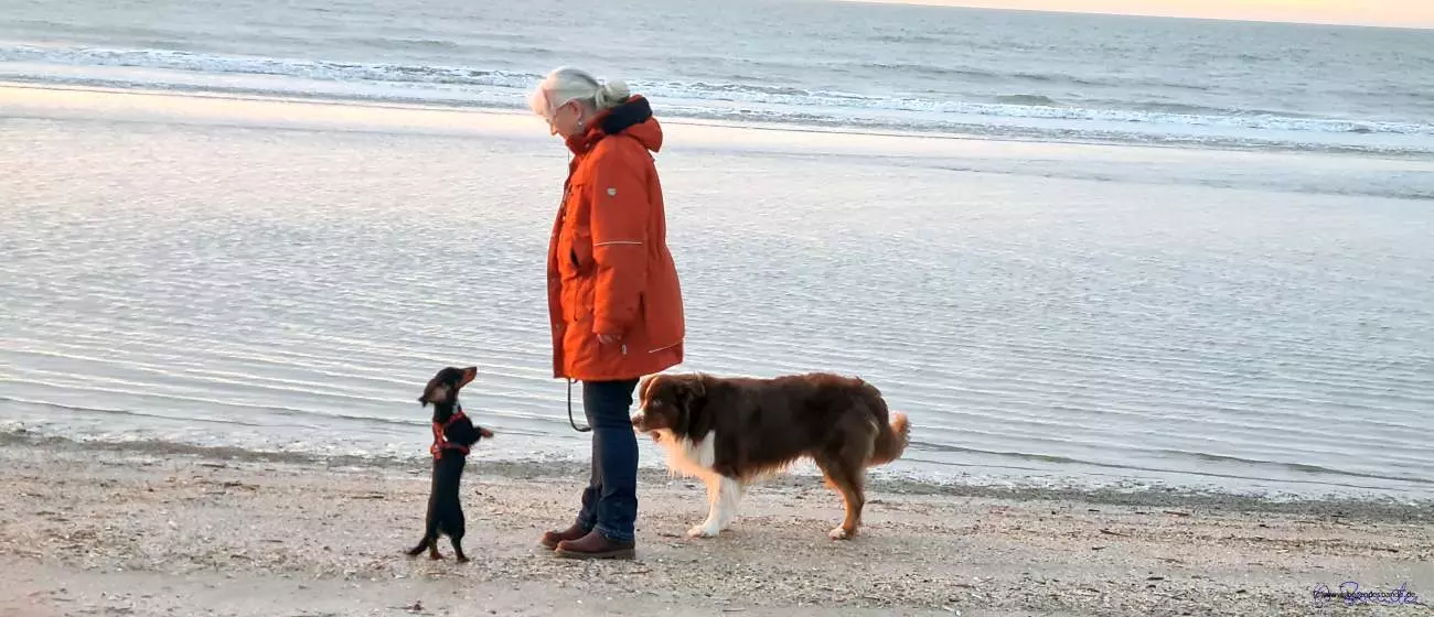 Tagsüber laufen wir ganz viel am Strand und der Knoppi mit seinen kurzen Beinen, läuft die ganze Strecke mit. Wenn der zu viel nervt, renn ich mal kurz weg. Da kommt der nicht mit. Manchmal ist der Knoppi auch farbenblind und springt statt an mir, an dem schwarzen Hund hoch. Draußen ist das nicht schlimm, aber wenn der Snickers müde ist, geht man dem besser aus dem Weg. Das vergisst der Depp manchmal und wenn der Dicke dann knatschig ist, legt sich der Knoppi ganz schnell auf den Rücken. Dann ist auch gut, der Snickers ist eigentlich ganz lieb. Neulich hat der sogar mich angemacht. Dabei wollte ich doch nur seinen Napf auslecken, da war noch was drin. Ja hör mal, der hat mich vielleicht angeflaumt - glaubste nicht - da lag ich dann auf dem Rücken. Man kann es ja mal versuchen...