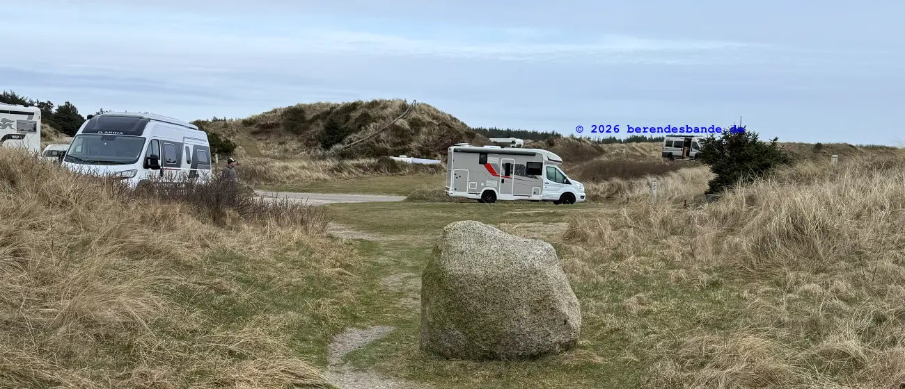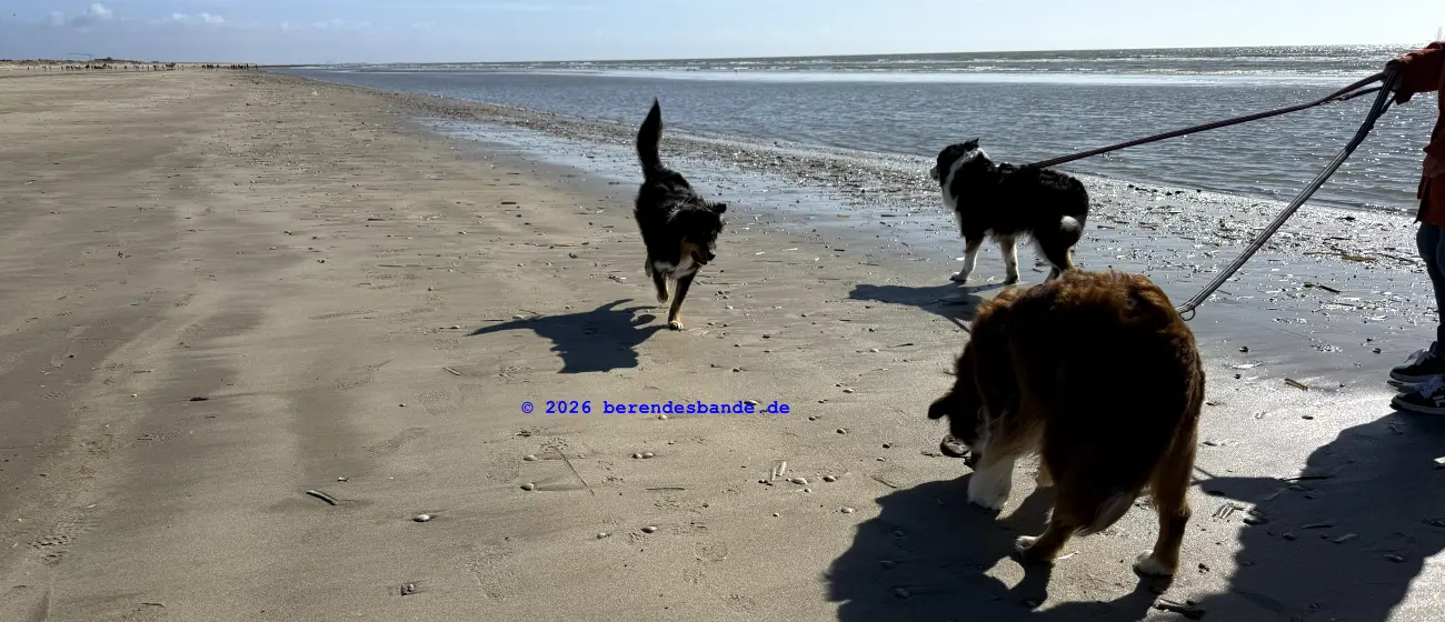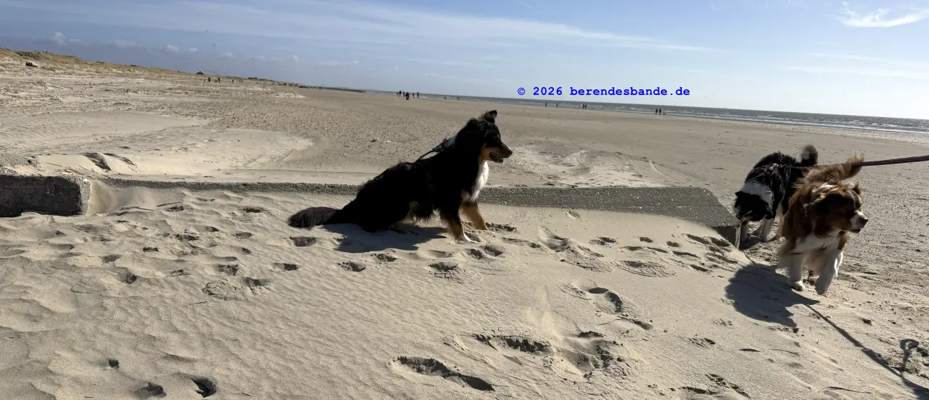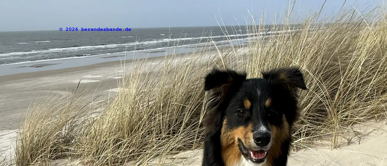 Dann kamen wir an eine andere Wiese und da war - niemand. Wir waren da ganz alleine. Gegenüber von der Wiese war ein Zaun, aber Herrchen konnte den Zaun auf machen, damit alle hinter den Zaun kamen. Dann mussten wir einen steilen Berg aus Wiese raufrennen und oben konnte man das Meer sehen, aber es war schon ziemlich weit weg. Auch auf der Wiese waren wir nur einen Tag, aber dann kamen wir auf einen tollen Abenteuerspielplatz. Ich sag euch, das war super. Von unserem Wohungsauto konnten wir sofort auf den Abenteuerspielplatz gehen, nur 100 m an der Leine laufen und dann ging der Spaß los. Da gab es hohe Berge aus Sand und überall gab es kleine Wege. Es roch nach allem Möglichen, Rehe, Mäuse, Hasen, Vögel und auch Füchse. Ich konnte immer die Berge rauf und runter rennen und alle Spuren suchen. Nach zwei so Sandbergen war da das Meer. Das war toll und laut, wegen der Wellen. Wir sind da manchmal spazieren gegangen, aber der Wind hat immer den Sand weggepustet. Das war nicht schön und hat immer in den Augen gekratzt. Der Devil hatte ein ganz doll rotes Auge und musste immer Tropfen ins Auge haben. Deshalb sind wir meistens nur in den Sandbergen gelaufen, wo die vielen Spuren waren. Herrchen hat immer gepfiffen, wenn ich zu weit weggerannt bin, aber manchmal hab ich ihn einfach überhört. Ist keine gute Idee Herrchen und Frauchen zu überhören. Dafür gibt es keine Leckerchen. Dafür komme ich an die Schleppleine. Die ist nur 10 Meter lang und ich kann nicht mehr durch die Dünen düsen. Nach zwei Tagen durfte ich wieder frei laufen. Ich bin dann immer gleich zurückgelaufen, wenn meine Leute gepfiffen haben.