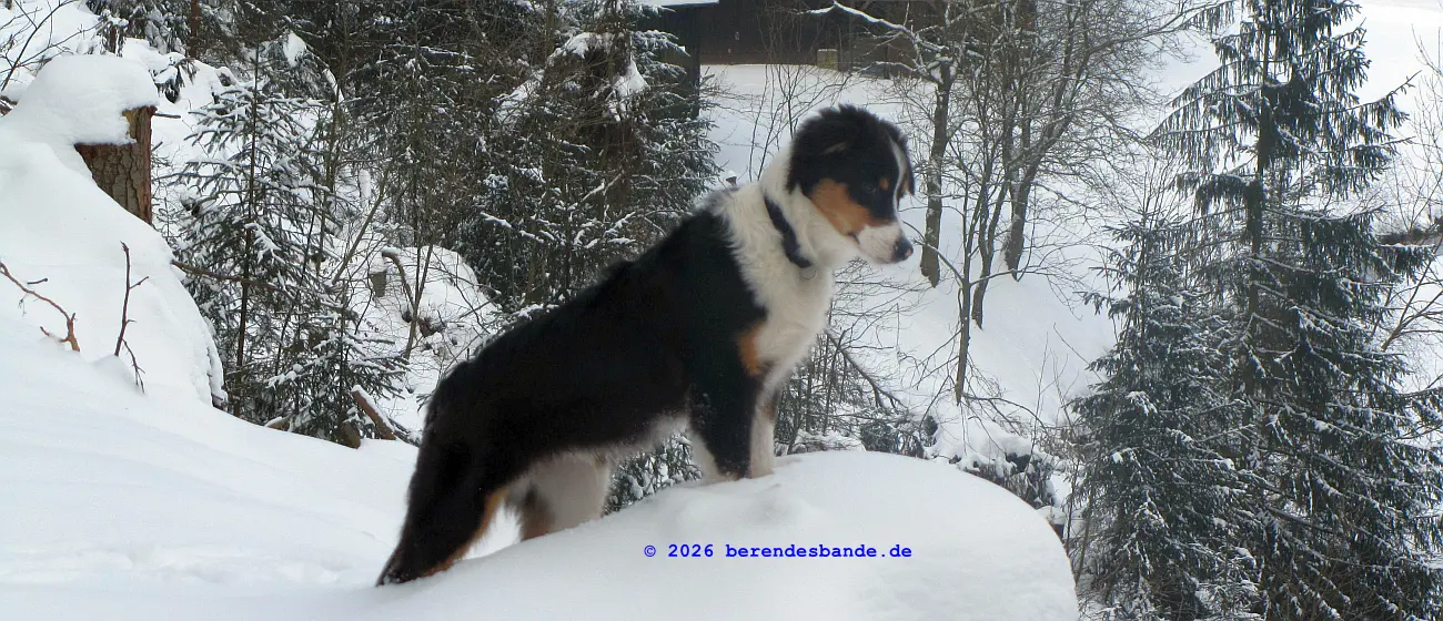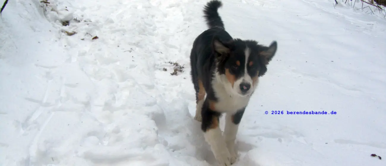 Am nächsten Tag haben Verena und Matthias ihre komischen Schuhe angezogen und wir haben die auf einen Berg raufgefahren. Da haben die die Latten und Stöcke mitgenommen und sind weggelaufen. Mit Frauchen und Herrchen bin ich dann gaaaannnnzz lange spazieren gegangen, im Wald, mit richtig viel Schnee. War schon schön, könnt ihr auf den Fotos gucken. Nachmittags haben wir die beiden wieder eingesammelt. Die waren verfroren, besonders Verena - tja, so ein Fell ist eben manchmal doch ganz gut. Abends sind wir dann wieder zu so einem Mc Doof gegangen. Aber da war es viel schöner, mit Teppich auf dem Boden und man musste sich das Essen auch nicht selber holen. Man bekam es an den Tisch gebracht. Ich hab unter dem Tisch geschlafen, der Tag war sooo anstrengend.