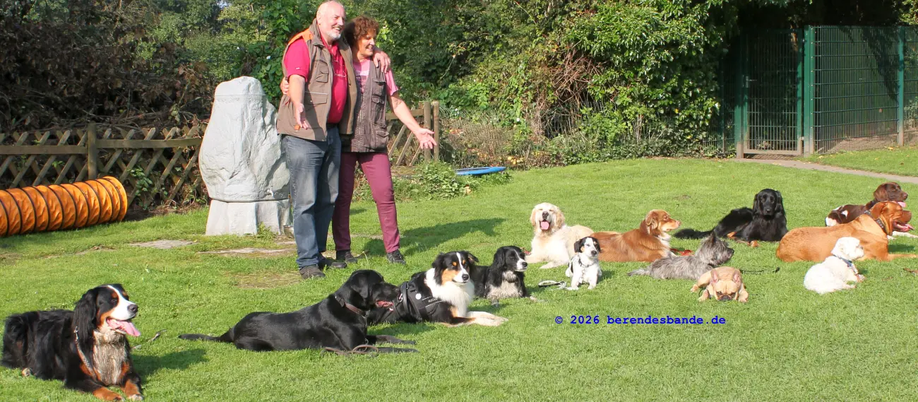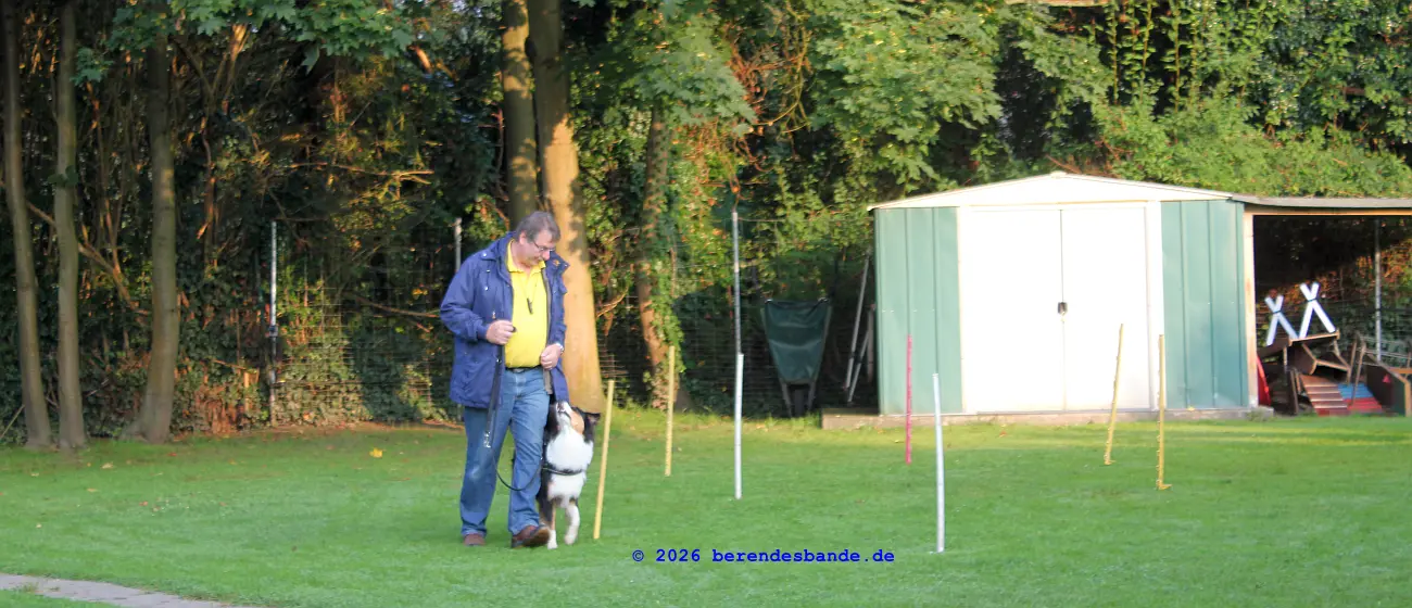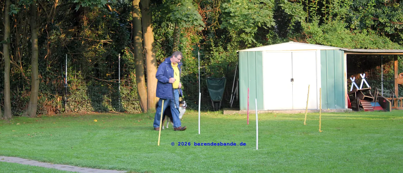 Einmal pro Woche treffen wir uns im Hundegarten und üben. Da kommen dann auch noch andere Hunde mit ihren Menschen hin. Das mit bei Fuß gehen, mit und ohne Leine können wir schon ganz lange. Jetzt müssen wir noch zusammen mit unserem Menschen über einen Stock springen. Oder ich muss mit Herrchen in der Mitte stehen und die anderen Menschen und Hunde kommen auf uns zu, bis sie ganz nah sind. Das macht mir gar nix aus, Herrchen auch nicht.
