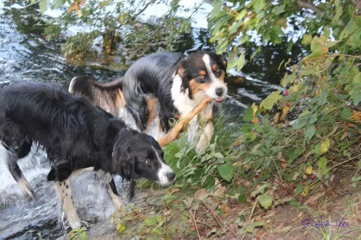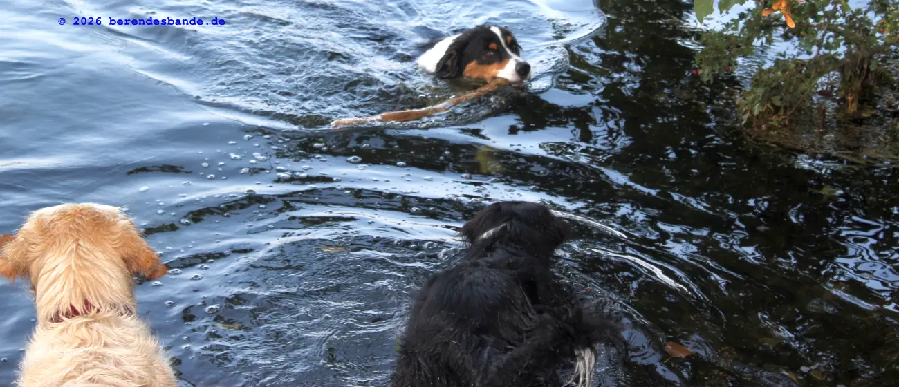 Nachdem alle Übungen fertig waren, sind wir mit einigen Hunden im Baldeneysee schwimmen gegangen. Das war toll, die Menschen haben Stöcke ins Wasser geworfen und die Hunde haben sich beeilt, die alle wieder rauszuholen. In der Zwischenzeit hat der fremde Mann dann die Zeugnisse gemalt. Nachher sind wir noch mit Barnabas und Frieda in ein Restaurant gegangen. Die Menschen haben gegessen und die Hunde haben geschlafen. Der Tag war echt anstrengend.