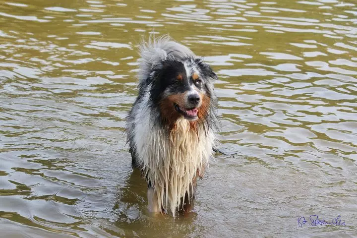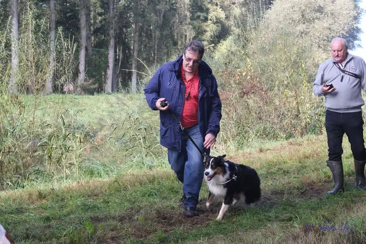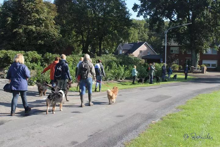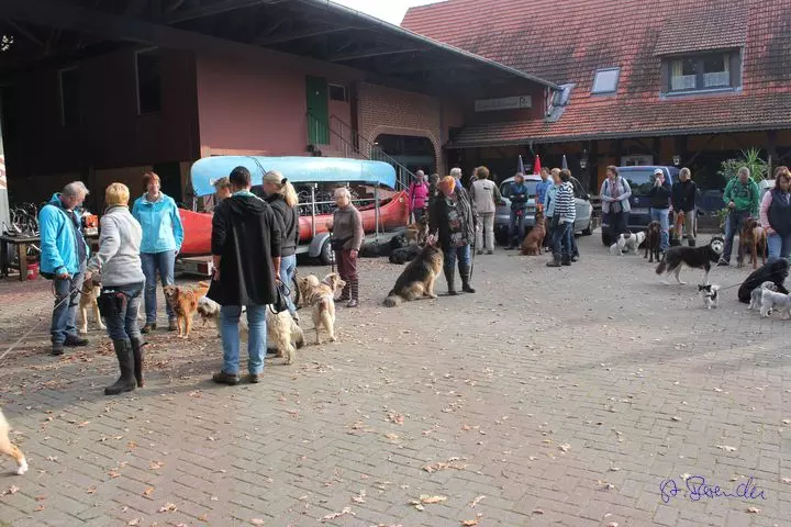 Dann waren wir da, auf einem Bauernhof. Da waren aber keine Tiere, Hühner oder Rinder. Da waren Leute von der Hundeschule, die Trainer und auch die Hunde - und der Buddy war auch da. Den kenn ich schon seit ich ein Welpe war. Also die Leute und die Hunde von der Hundeschule haben sich da getroffen und die ganzen Hunde konnten da rumlaufen, spielen und toben. Die Menschen haben sich unterhalten und gegessen. Dann sind wir alle zusammen noch eine kleine Runde gegangen - echt toll, es war nämlich voll dunkel. Danach sind wir in ein Zimmer gegangen, wo wir schlafen konnten, also Frauchen und Herrchen und ich. Die Anderen haben bestimmt auch irgendwo geschlafen, denn am nächsten Morgen waren sie alle noch da. Nach dem Frühstück sind wir mit Jutta und Werner eine große Runde gelaufen. Immer an einem Fluss lang. Zwischendurch konnten wir da auch schwimmen gehen, die Hunde meine ich. Ich glaub, den Menschen war es zu kalt. Später kam die Sonne und da wurde es auch wieder wärmer. Wir konnten fast die ganze Zeit ohne Leine laufen, das war super. Es waren 30 Menschen und 40 Hunde mit. Da war richtig was los.