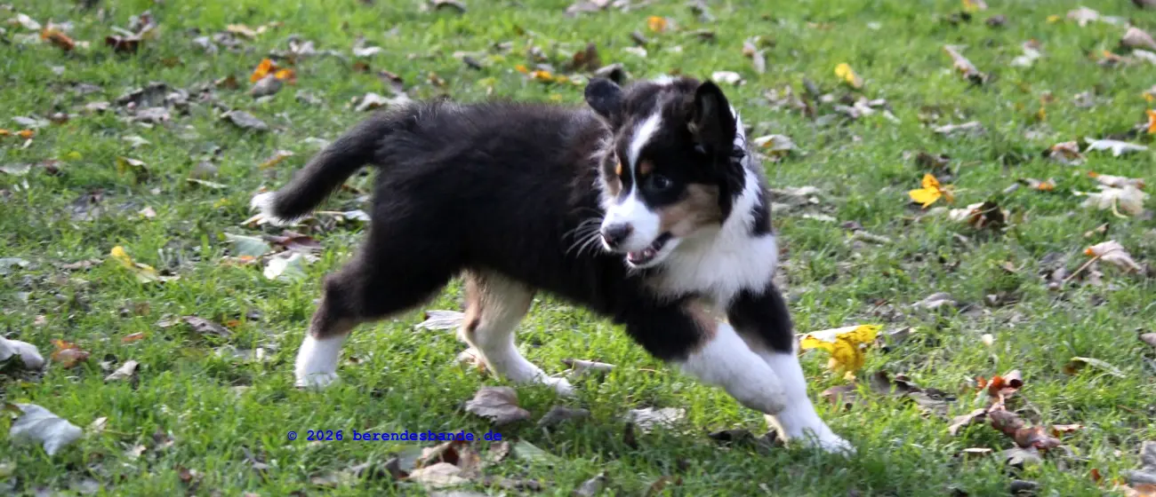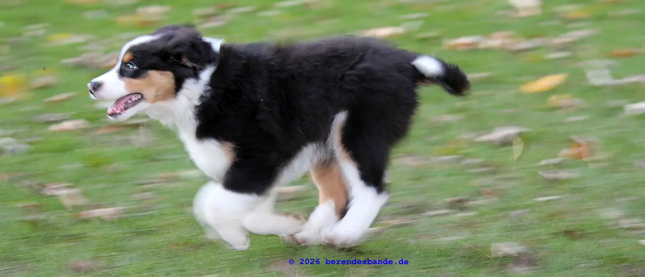 Ich spiele viel lieber mit den Hunden draußen im Wald. Das macht super viel Spaß. Und samstags gehen wir zum Welpentreff. Da treffe ich Nuka, der ist auch ein Australien Shepherd, so wie ich, nur eine Woche älter. Und Anton ist auch da und Barney und - ach ich kann mir die ganzen Namen noch gar nicht merken. Aber wir haben da immer viel Spaß. Erst üben wir ein paar Sachen und dann können wir rumtollen. Danach machen wir noch ein paar Kunststücke, über eine Rampe laufen, oder durch einen Tunnel. Das ist cool und ich mach sowas gerne. Am Ende bin ich immer müde und muss mich ausruhen.