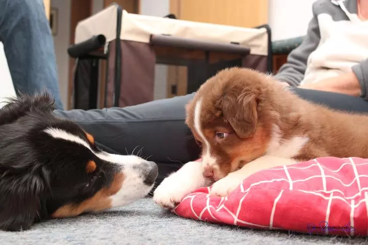 Das fand ich völlig uncool. Als sie mich dann rausgelassen haben, hatten sie noch einen anderen Hund an der Leine, so einen kleinen braunen Zwerg. Ich hab den mal beschnuppert, aber der war auch uncool – ein Baby eben. Aber dann haben die den Zwerg mit nach Hause genommen. Und der Typ meinte, er könnte jetzt einfach alles machen, aus meinem Napf saufen, in mein Körbchen klettern usw. Na, da hab ich dem erst mal kräftig Bescheid gesagt – der spinnt wohl. Aber irgendwie fanden meine Leute, dass der jetzt auch bei uns wohnen soll. Dann musste ich in unserer Wohnung an die Leine, weil ich den Zwerg immer angebellt hab. Dabei hab ich dem nur klarmachen wollen, dass er nix zu melden hat. Am nächsten Tag hab ich ihm dann ein bisschen mehr Freiraum gelassen und dann brauchte ich nicht mehr an die Leine. Aber eins sag ich Euch, auf meine Couch kommt der Kerl nicht! Wobei, so ein bisschen cool finde ich den ja vielleicht doch. Ich kann es mir ja nochmal überlegen…