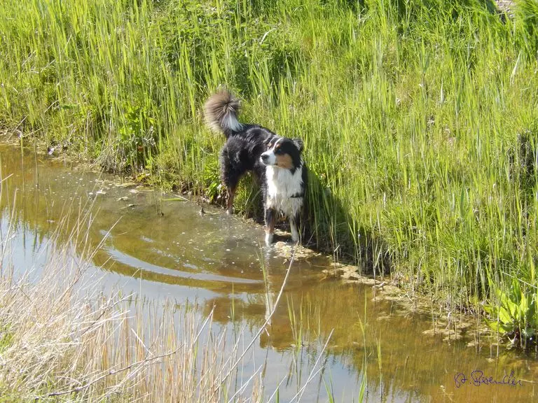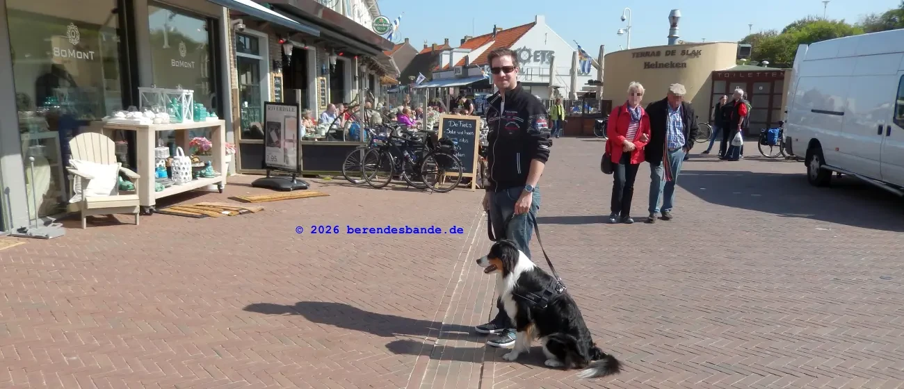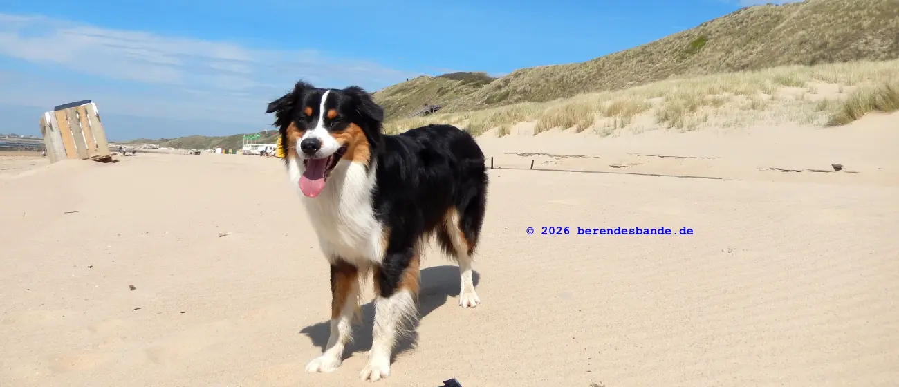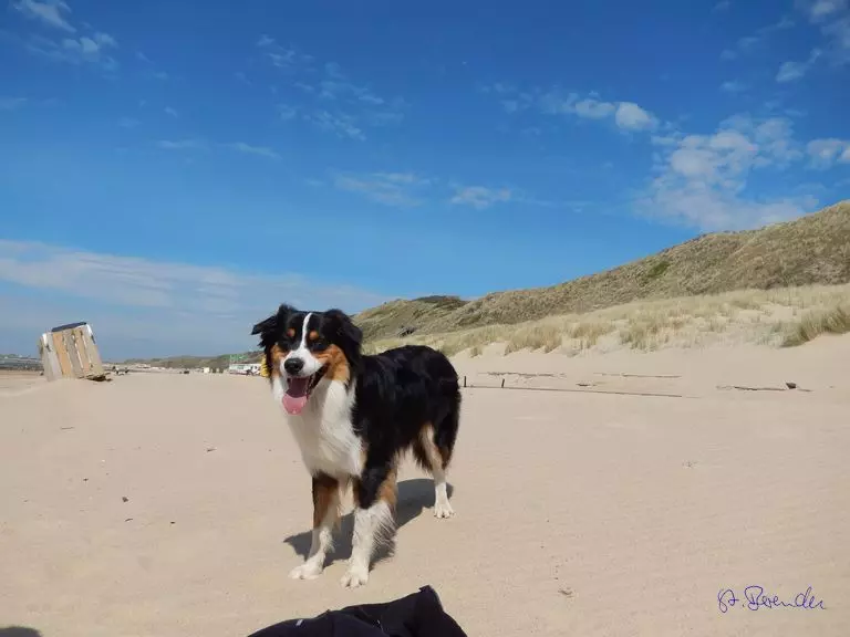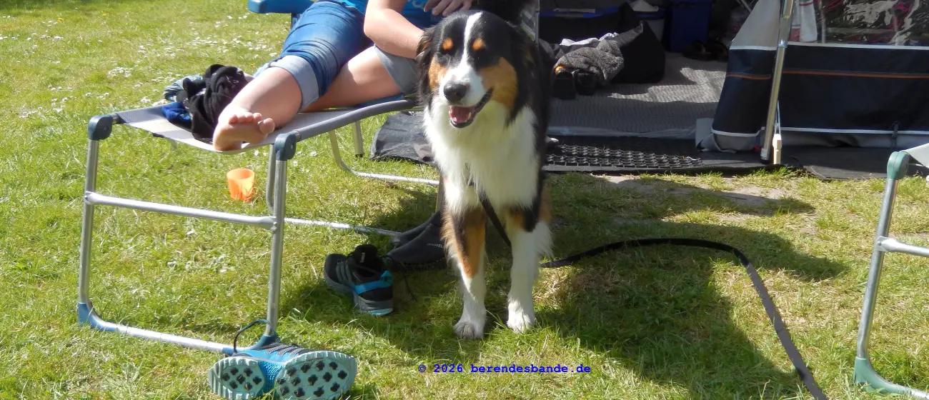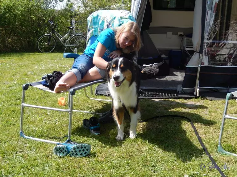 Wir waren wieder am Meer, da waren wir schon öfter, ich meine an dem Meer, wo wir zu Ostern waren. Wir haben unseren Wohnwagen mitgenommen und auf eine schöne Wiese gestellt. Ich konnte den ganzen Tag draußen liegen und gucken – das war echt toll. Ich hab auch nicht gebellt, wenn die Nachbarn zu nah an unser Zelt gekommen sind, nur wenn der Terrier auf der anderen Seite des Weges gebellt hat, dann hab ich mitgemacht – bis Frauchen oder Herrchen geschimpft haben – aber ich kann mir ja nicht alles gefallen lassen.