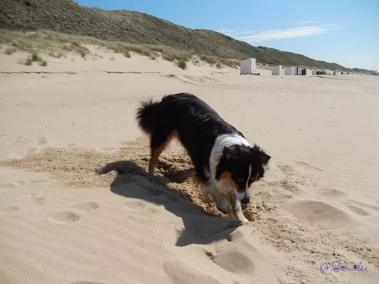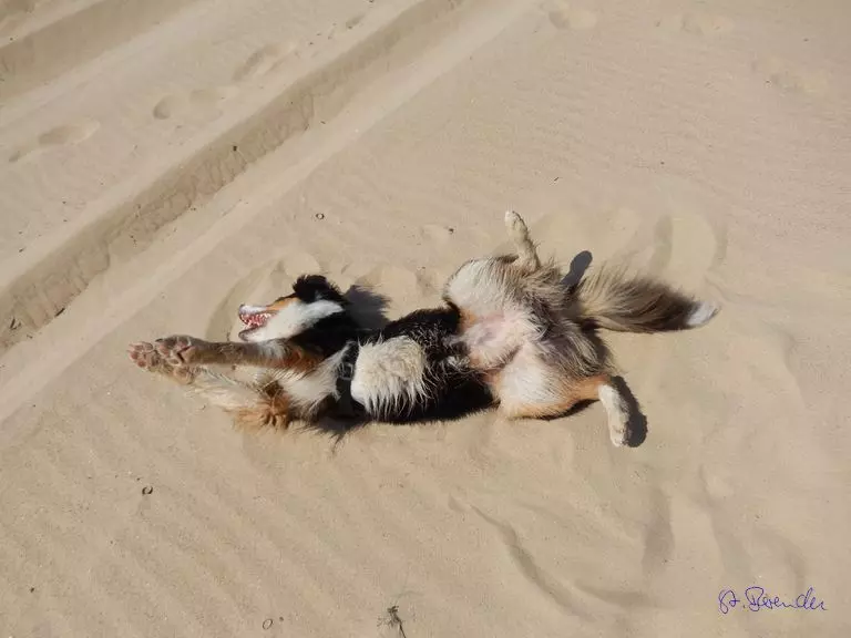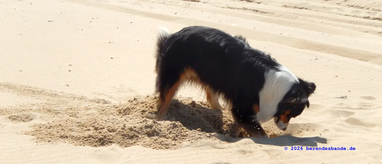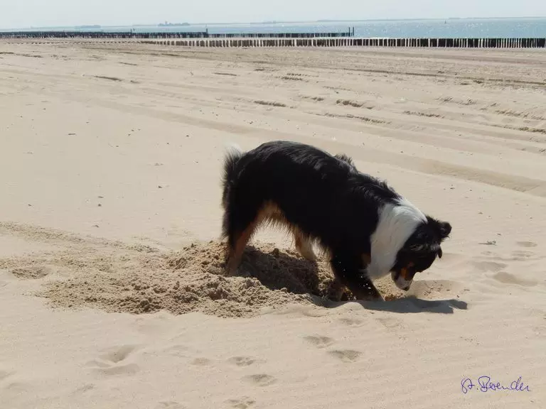 Wir haben schöne Spaziergänge gemacht und waren am Strand. Da konnte ich mich toll im Sand rekeln und Löcher buddeln. Benjamin und Verena waren auch ein paar Tage da und die Oma, die war die ganze Zeit mit. Oma hat einen Vogel – ich meine, so einen richtigen Vogel, der in so einem Drahtkasten sitzt. Der war auch mit, der Vogel mit Drahtkasten. Der stand während der Fahrt auf dem Rücksitz im Auto. Als ich mir von hinten aus dem Kofferraum den Kerl mal genauer angucken wollte und mich am Gitter vorbeiquetschen wollte, hat Oma fast einen Herzinfarkt bekommen. Dabei bin ich ganz lieb, ich wollte nur mal gucken…