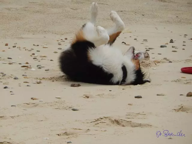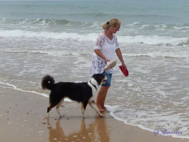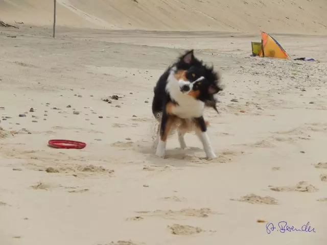 Diesmal waren wir aber an einem anderen Meer. Das Meer war ganz schön wild. Es gab hohe Wellen und das fand ich schon ein bisschen gruselig. So schön schwimmen wie im letzten Jahr konnte ich da nicht. Das Wasser hat mich immer mitgezogen. Herrchen und Frauchen sind auch nur mit den Füßen ins Wasser gegangen und waren nicht mit mir schwimmen. Ich glaube, die fanden das auch gruselig.