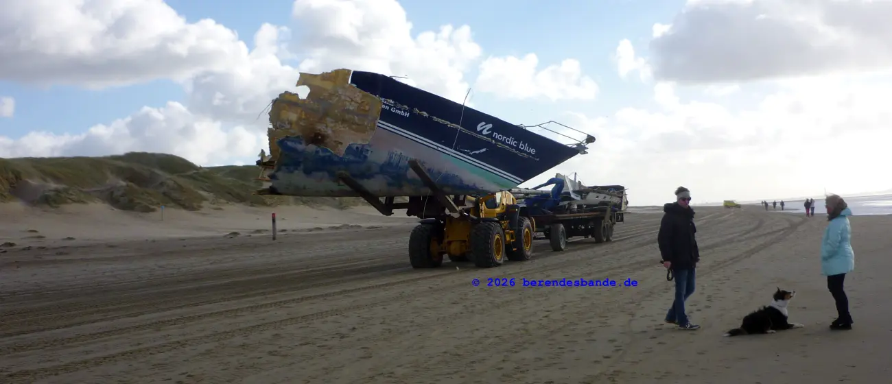 An einem stürmischen Tag waren große Laster und Bagger am Strand. Die haben ein ziemlich kaputtes Segelschiff abgeholt, das da rumlag. Es war in der Mitte durchgebrochen. Herrchen hat gesagt, dass die Menschen von dem Segelboot zum Glück gerettet worden sind.