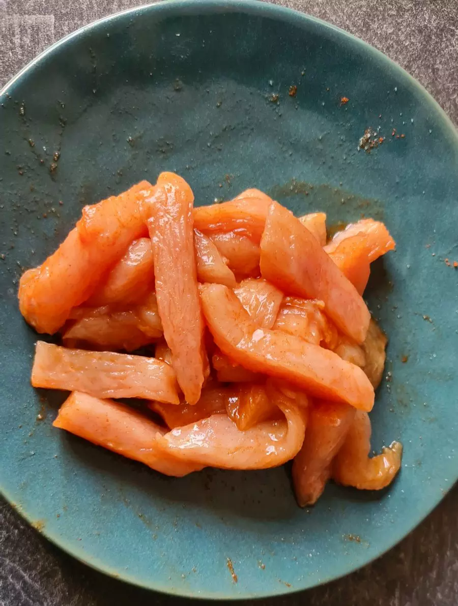 Etwas Öl in einer Pfanne erhitzen. Das Fleisch mit Salz und Paprikapulver würzen und von allen Seiten scharf anbraten. Dann die Hitze reduzieren und durchgaren. Das Fleisch in mundgerechte Stücke schneiden.