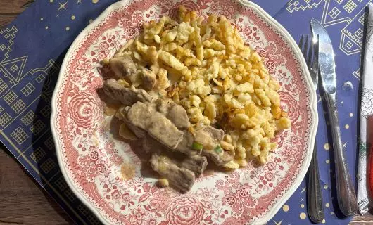 In einer großen Pfanne Butter schmelzen und die Spätzle darin anrösten. Kurz vor dem Anrichten das Fleisch und ggf. den Bratensaft in die Sauce geben und kurz erwärmen. Je nach Konsistenz die Sauce mit etwas Speisestärke andicken.