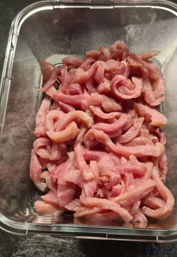 Das Fleisch in schmale Streifen schneiden. Die Zwiebel schälen und in dünne Streifen schneiden. Den Knoblauch schälen und durch die Presse in eine Tasse drücken. Olivenöl, Paprika, Salz, Kreuzkümmel, Majoran und den Zitronensaft in die Tasse geben und alles gut durchrühren. Das Fleisch in eine Schale geben und mit der Gewürzmischung übergießen. Eine Zwiebel schälen und in dünne Streifen schneiden, dann zum Fleisch geben. Alles gut verrühren und über Nacht im Kühlschrank marinieren.