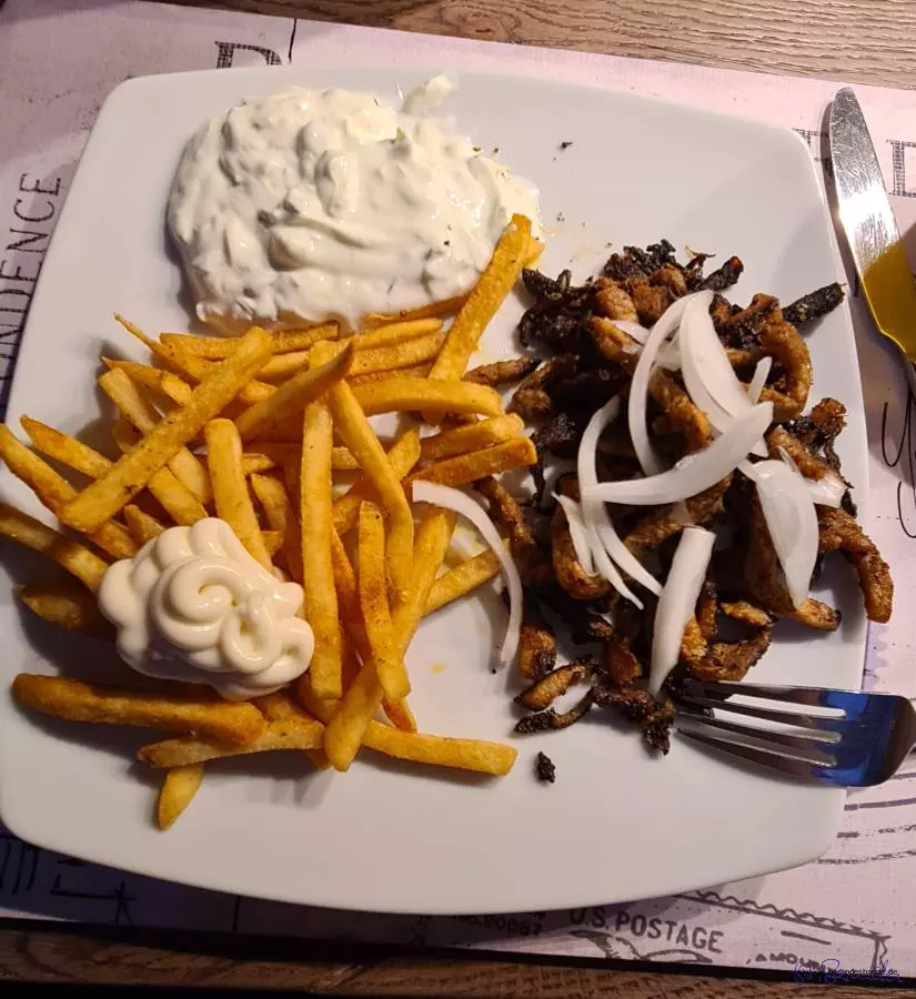 Eine Pfanne erhitzen und das Fleisch von allen Seiten knusprig braten. Die zweite Zwiebel schälen und in dünne Streifen schneiden. Beim Anrichten das Fleisch mit Oregano und Zwiebelstücken bestreuen. Dazu gibt es Zaziki, (findet ihr im Rezept zum Hähnchenborrito) und Pommes Frites.