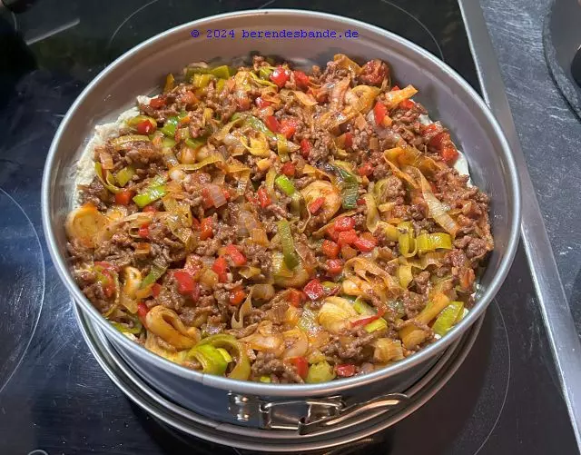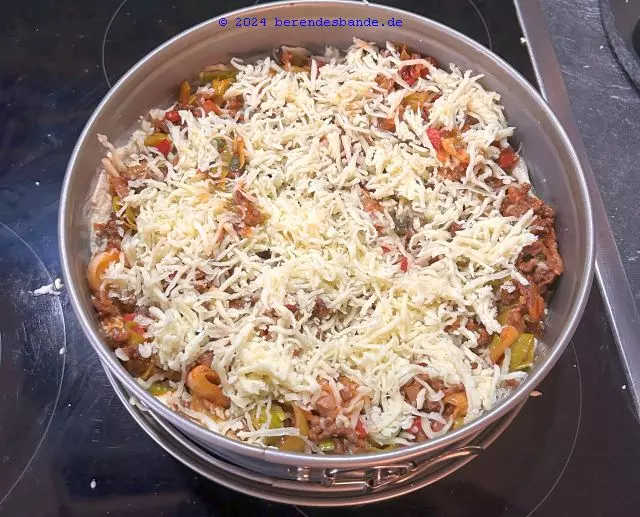In der Zwischenzeit die Margarine mit einem Teelöffel Salz, dem Mehl und dem Wasser zu einem festen Teig kneten. Den Backofen (Umluft) auf 160 Grad vorheizen. Eine Springform einfetten und den Teig hineingeben. Mit den Fingern gleichmäßig in der Form verteilen und einen etwa 2 cm hohen Rand erzeugen. Den Pfanneninhalt in die Form geben und verteilen. Mit Käse bestreuen und 35 Minuten backen.