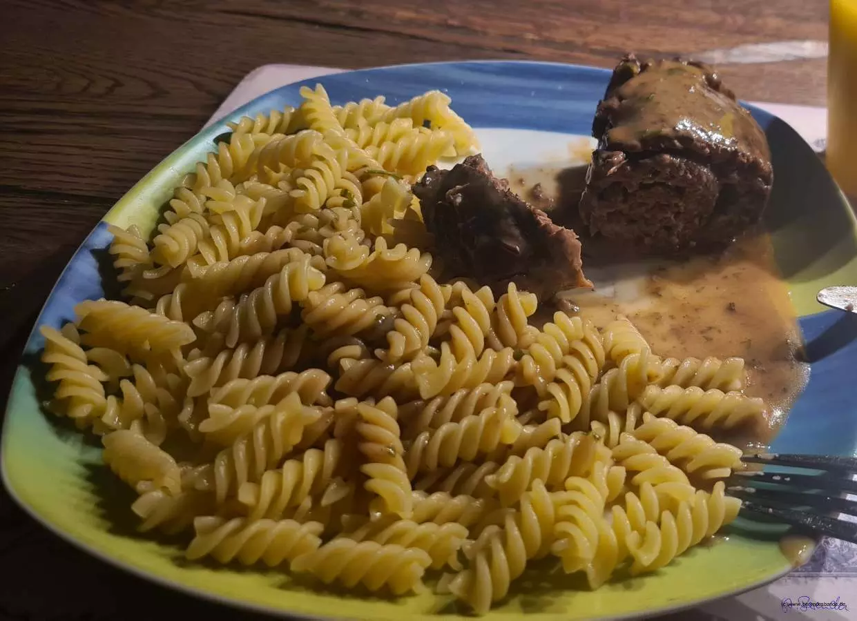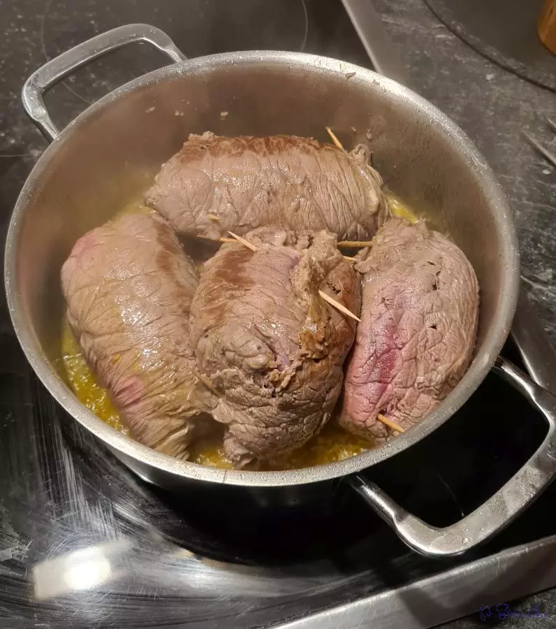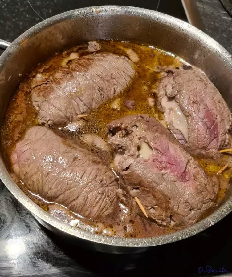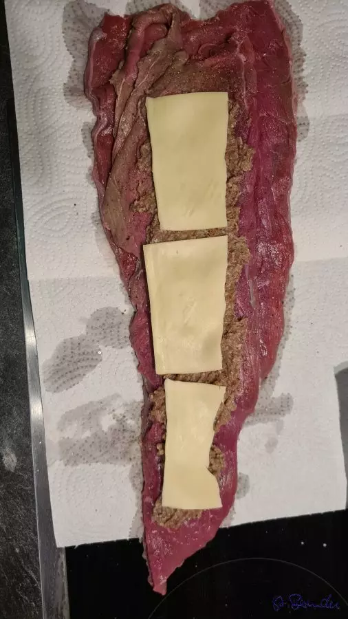Die Zwiebel und den Knoblauch schälen und grob zerteilen. Die Gurken grob zerteilen. Die Petersilie fein hacken. Aus Knoblauch, Zwiebel, Senf und Meerrettich mit dem Pürierstab eine Paste herstellen. Das Hackfleisch pfeffern und salzen und die Paste dazugeben. Alles gut mit einer Gabel vermengen. Die Rouladen waschen und abtupfen. Von der Innenseite pfeffern und salzen. Dann das Hackfleisch dünn auf die Roulade streichen. Mit 1,5 Scheiben Käse je Roulade belegen. Die Rouladen vom schmalen Ende her aufrollen und mit Zahnstochern fixieren. In einem Topf das Öl erhitzen und die Rouladen kurz von allen Seiten scharf anbraten. Dann die Hitze reduzieren und mit dem Rotwein ablöschen. Die Gemüsebrühe zugeben und 1,5 Stunden auf kleiner Flamme kochen lassen. Ab und zu die Rouladen wenden. Dann die Rouladen aus dem Topf nehmen, die Speisestärke mit etwas Wasser auflösen und in die Soße geben. Das Ganze kurz aufkochen lassen. Mit Pfeffer Salz, Creme Fraiche, Petersilie und Rotwein abschmecken. Die Rouladen wieder in die Soße geben.