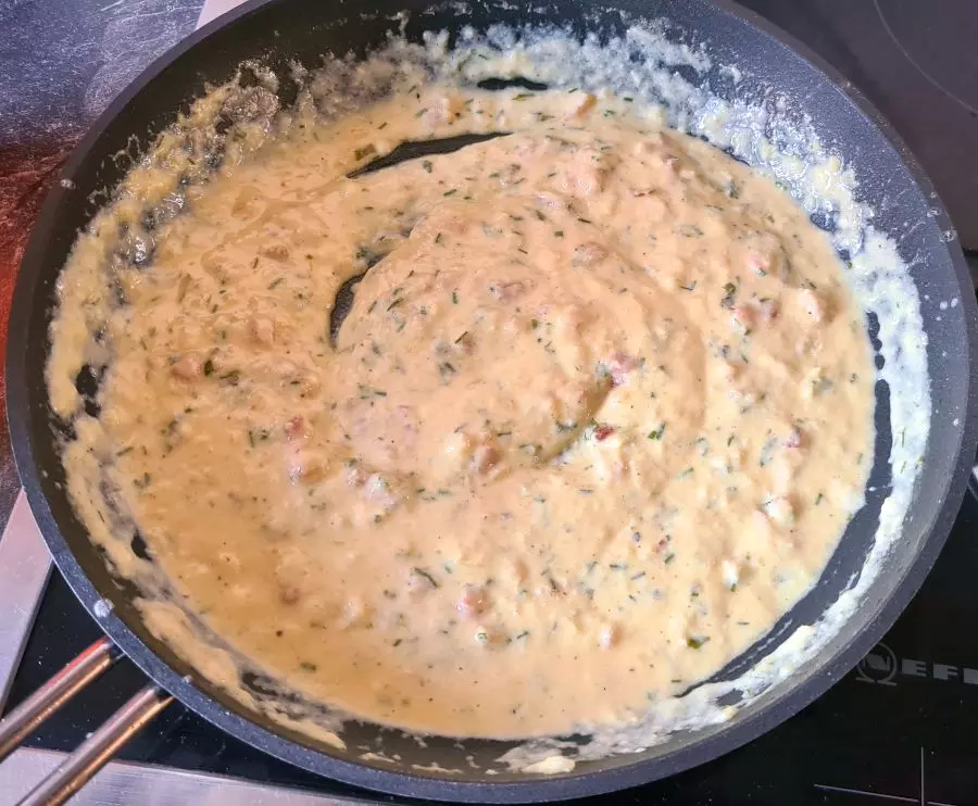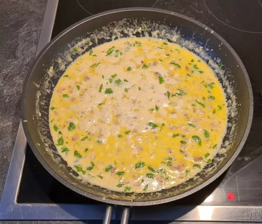 Das Öl in einer Pfanne erhitzen und den Schinken oder die Speckwürfel leicht anbraten, dann Zwiebeln und Knoblauch zugeben. Die Hitze reduzieren, die Zwiebeln nur glasig schwitzen und mit Salz und Pfeffer würzen. Die Creme Fraise unterrühren und die Milch zugeben. Die Eier in einem Becher aufschlagen, mit Salz, Pfeffer und Muskatnuss würzen und mit einer Gabel verquirlen. Die Soße gut rühren und die Temperatur knapp unter dem Siedepunkt halten, bis die Spaghetti gar sind.