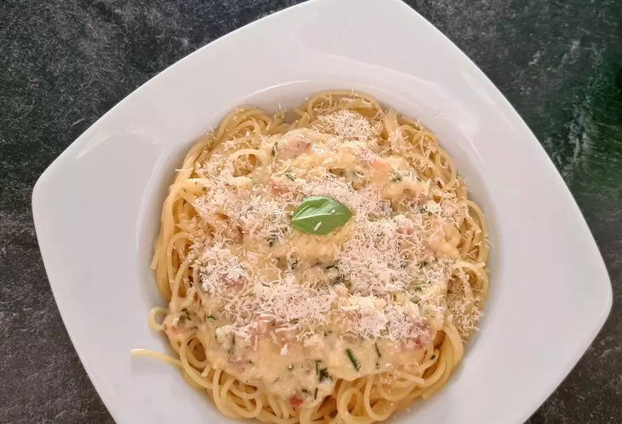 Spaghetti auf die Teller geben und mit der Carbonara Soße übergießen. Ein Esslöffel Geriebenen Parmesan darüber streuen.