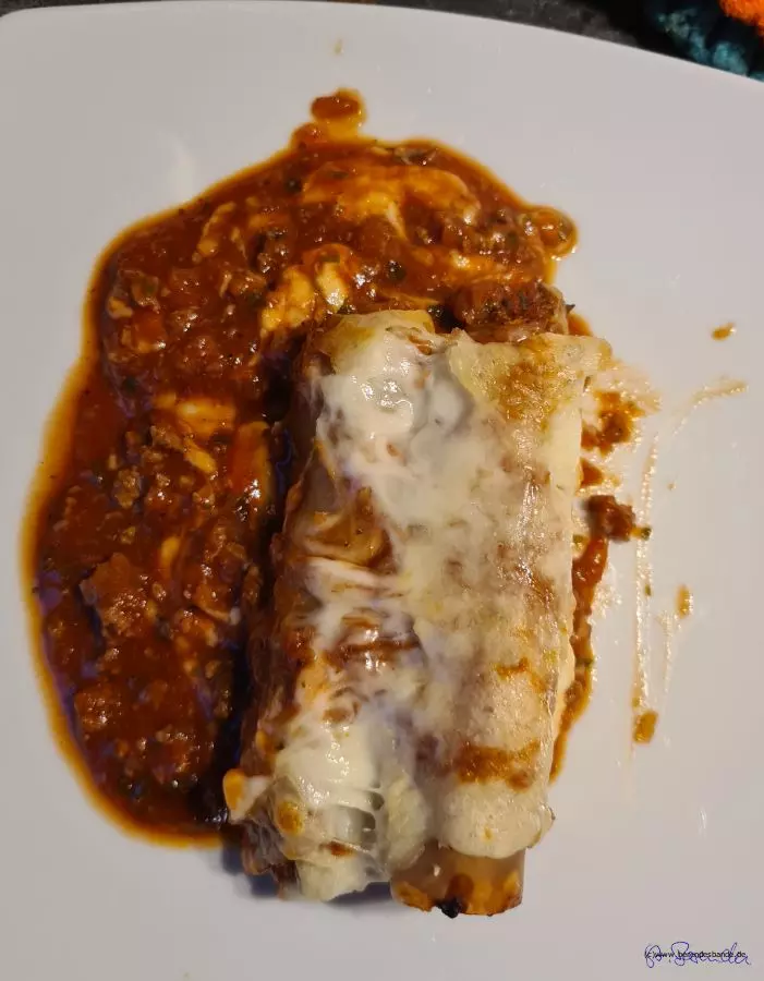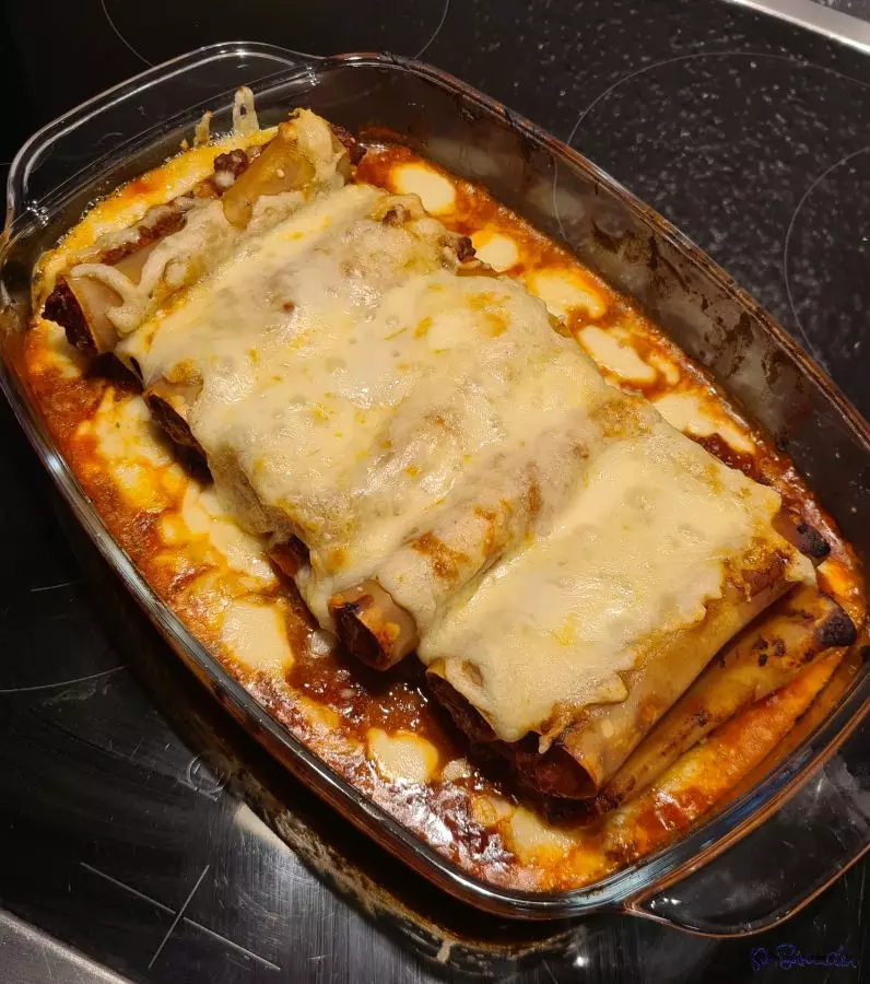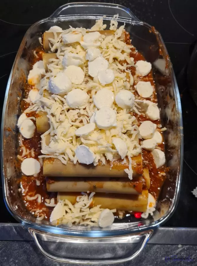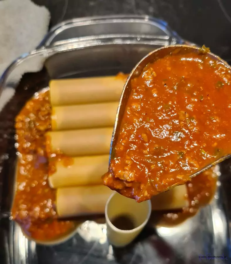 Die Soße etwas abkühlen lassen, dann mit einem Soßenlöffel die Soße in die ungekochten Canelloni füllen und in eine Auflaufform geben. Die Nudeln zwei Reihen hoch stapeln. Mit geraspelten Gouda bestreuen und im vorgeheizten Backofen ca. 25 Minuten garen.