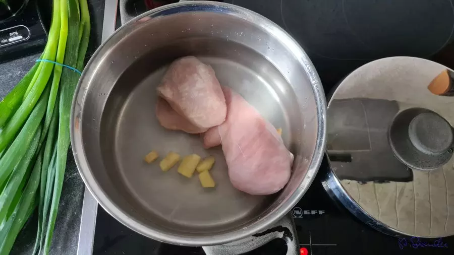 Den Ingwer schälen und in Scheiben schneiden. In einem großen Topf 2 Liter Salzwasser zusammen mit dem Fleisch und dem Ingwer 30 Minuten kochen. Das Fleisch aus dem Sud nehmen und abkühlen lassen. Den Ingwer aus dem Sud nehmen und entsorgen. Die Mu Err Pilze mit kochendem Wasser übergießen und bei kleiner Flamme 30 Minuten köcheln lassen. Das Pilzwasser abgießen und die Pilze zerkleinern.