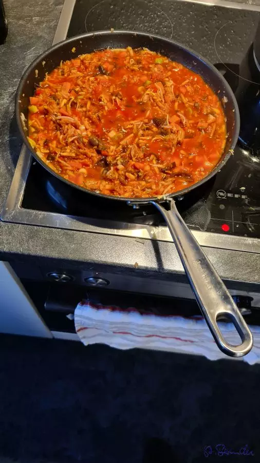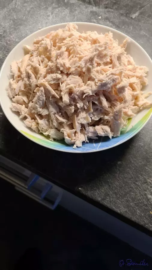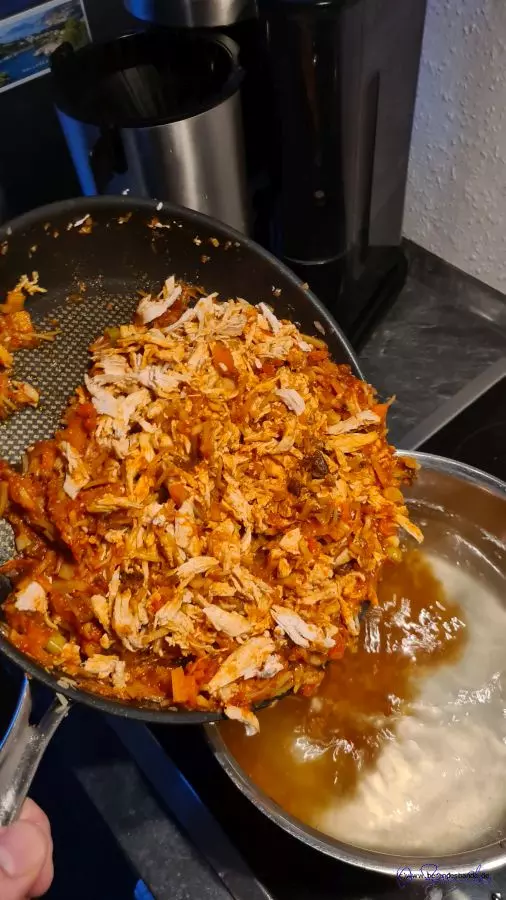 Das Fleisch in kleine Stücke reißen. Das geht ganz gut mit einer Gabel. Dann kommet es mit in die Pfanne. Den Pfanneninhalt in den Ingwersud geben, Reisessig, Honig und Sesamöl zugeben und zum Kochen bringen. Mit Salz, Honig und Sambal abschmecken. Die Möhren zufügen und 10 Minuten mit kochen lassen. Die Speisestärke in etwas Wasser auflösen und unter Rühren in die Suppe geben.