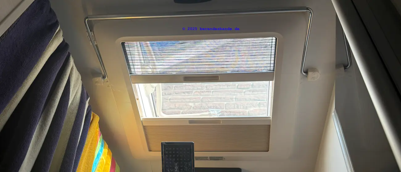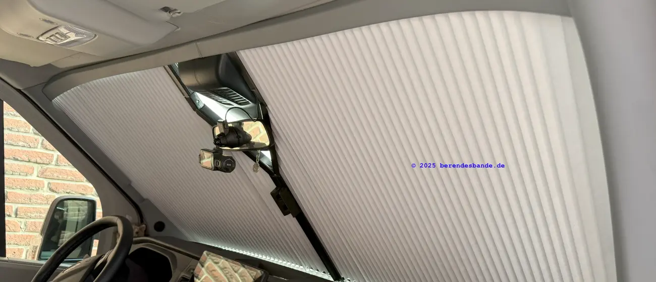 Dem versierten Heimwerker dürfte die Montage gelingen, zudem Remis auf YouTube ein Einbauvideo veröffentlicht hat. Zeitlich sollte man ein bis zwei Stunden einplanen. Eine kleine Hürde war die Montage des unteren Führungsrohr. Angeblich soll die linke Seite gelb markiert sein. Doch beide Teilstücke waren unmarkiert und identisch. Den Platz für das Lager, das in der Mitte des Armaturenbrettes angebracht wird, muss empirisch gefunden werden, bevor man die beiden Löcher zur Befestigung bohrt. Dazu sollte man das Plissee schließen, um sicherstellen, dass der Magnetverschluss in der Mitte auch greift. Letztendlich wurde der Umbau erfolgreich umgesetzt. Die Handhabung ist deutlich besser als mit dem Dometic Rollo. Eine Blende für das Führungsrohr an der Unterseite wäre wünschenswert, da zwischen Armaturenbrett und Plissee ein Spalt viel Licht durchlässt. Der Preis für das Plissee ist mit 500 € ziemlich üppig. Unsere Dashcam musste weichen. Das Remisfront liegt näher an der Frontscheibe als das Dometic Rollo. Die Dashcam hat ihren neuen Platz auf dem völlig nutzlosen Innenspiegel gefunden 😀.