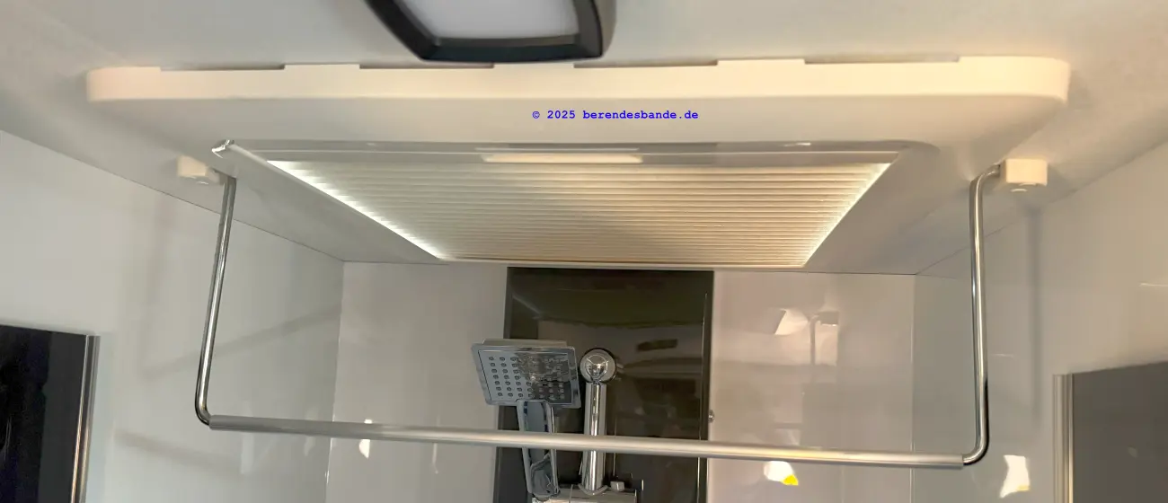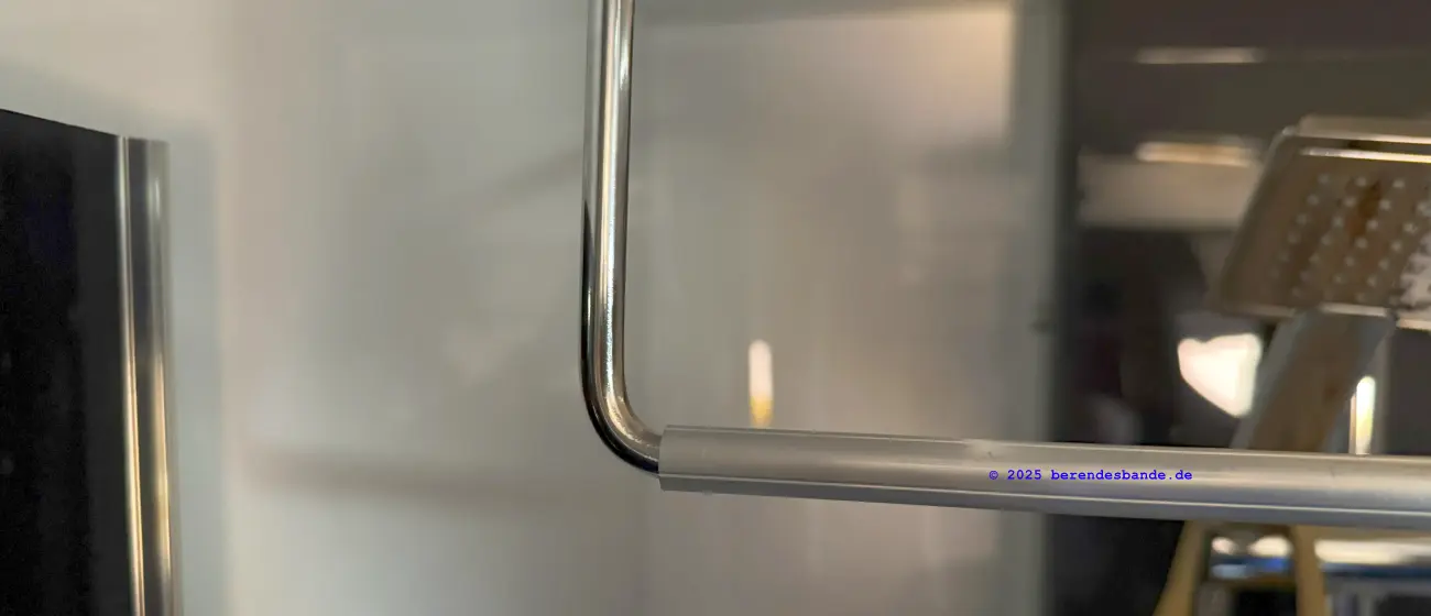 Ich besorge mir im Baumarkt ein 1m langes 11,5 mm dickes Alurohr. Dieses lässt sich über den Bügel schieben und hat nur wenig Spiel. Dieses Rohr kürze ich auf die Länge von 51 cm. Den Bügel trenne ich an der breitesten Stelle mittig in zwei Hälften. Ich schiebe das Rohr über die beiden Hälften und montiere die beiden Halter an den alten Stellen, jedoch um etwa 2 cm in Richtung der Badmitte versetzt, damit der Bügel auch vorne an der Rollo-Kassette vorbei passt. Der Halter, der den Bügel beim Duschen an der Decke hält, montiere ich seitlich neben der Befestigung des Gelenkes, da durch das übergestülpte Rohr der Durchmesser vergrößert wurde. Man kann auch etwas Kleber auf beiden Seiten des Rohres einfüllen, bevor man den Bügel einschiebt, damit es keine Geräusche gibt. Wirklich nötig ist es jedoch nicht. Die Löcher in der Decke von an der alten Befestigungsposition habe ich mit Holzkitt verschlossen. Am Ende sieht es so aus, als ob es immer schon so gewesen wäre. Auch hier benötigt man etwa 1,5 Stunden Zeit, um alles chic zu machen. Mit etwa 150 € ist diese Verbesserung deutlich günstiger, als das Frontplissee. Aufgepasst beim Fensterkauf: Man benötigt das Mini Heki für die Einbautiefe 43-60 mm. Es ist bei Obelink oder Camping Wagner zu haben.
