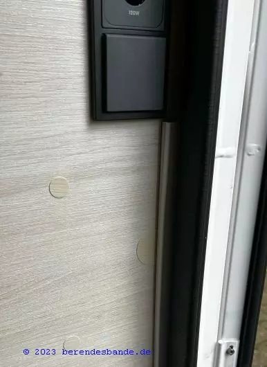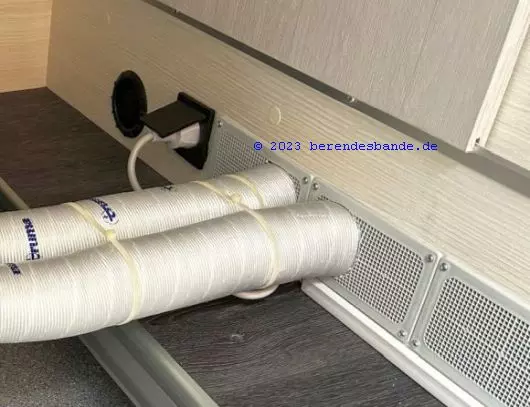 Eine weitere Steckdose habe ich in der Garage zur Versorgung der Klimaanlage installiert. Die Spannung dazu habe ich an der vorhandenen Steckdose der Heckgarage abgegriffen. Die Verlegung des Kabels erfolgte in einem schmalen Kabelkanal, der hinter der Gummidichtung der Hecktür und am Boden unterhalb der Schiebetür kaum auffällt.