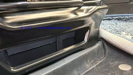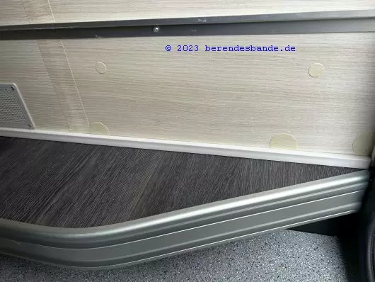 Nach der Schottlandtour im Sommer 23 habe ich noch folgende Arbeiten durchgeführt. Snickers hatte sich seine Verletzung am Beifahrersitz zugezogen. Hier sind scharfe Kanten. Zum einen von oben, direkt unterhalb des Hebels mit dem die Sitzposition verstellt wird. Hier hatte ich mir beim Saubermachen auch schon einen Kratzer zugezogen. Diese Kante wird jetzt durch ein Kantenschutzprofil entschärft. Dann ist von vorne eine trapezförmige Öffnung im Blech. Die Kante ist zwar nach innen gebogen, sie war jedoch die Ursache für Snickers Verletzung, da sich seine Pfote in der Öffnung verhakt hatte. Hier habe ich eine 300 mm x 60 mm x 3 mm Acrylglasplatte auf der Innenseite angebracht. Diese wird durch zwei Schrauben gehalten. Im Blech wurden dafür zwei 4 mm Bohrungen nötig.