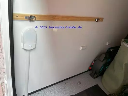 Damit sind wir dann in der Garage. Das Klimagerät ist nahezu mittig in der Garage verbaut. Die nachfolgenden Tipps sind natürlich unseren Bedürfnissen geschuldet, ob dies für andere Camper ebenfalls funktionieren, muss jeder für sich entscheiden. Unsere Campingstühle stehen aufrecht an der Rückwand der Garage, gleich an der rechten Garagentür. Damit die Stühle nicht nach vorne kippen, habe ich eine Holzleiste mit zwei weiteren Zurrösen an der Rückseite verklebt. Darüber hinaus habe ich eine weiter Zurröse am Boden befestigt. Mit zwei Expandergummis bleiben nun die Stühle während der Fahrt an ihrem Platz.