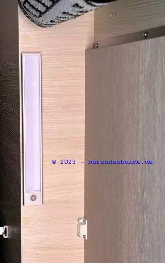 Die Schrankleuchte wurde gegen eine leistungsfähigere, wiederaufladbare Lampe ersetzt. Diese ist mit Magnetpads befestigt, so dass das Aufladen kein Problem ist. Sie hat ebenfalls einen Bewegungsmelder, so dass da Licht beim Öffnen der Schranktür automatisch eingeschaltet wird. Ein weiterer Vorteil ist ein Ein-Ausschalter, der der Challengerleuchte fehlte. Ich habe diese Leuchte im Doppelpack bei Amazon für etwa 20 € gekauft. Die zweite Leuchte habe ich in der Garage, rechts neben der Luke angebracht. Nun tappt man nicht mehr im Dunkeln, wenn man von der Luke her in die Garage greift.