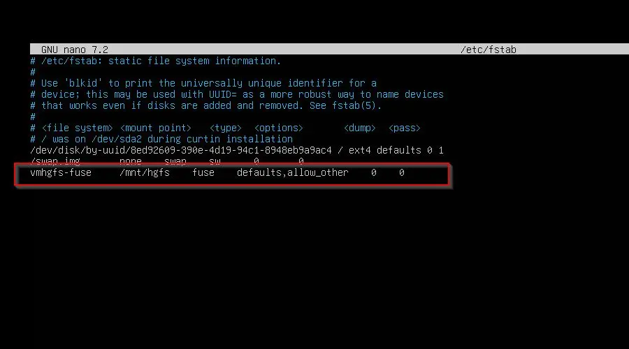 • vmhgfs-fuse   /mnt/hgfs    fuse    defaults,allow_other    0    0
