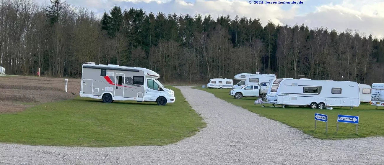 Dann ist es so weit, Emma ist einsatzbereit und es geht los. Der grobe Plan legt die Ostseite von Dänemark mit den Inseln als Ziel fest. Wir fahren eine große Etappe über die A1, passieren den Elbtunnel ohne Probleme, wechseln auf die A7 und fahren über die dänische Grenze bis Kolding. Dort bleiben wir die erste Nacht bei Kolding City Camp. Der Platz wurde 2023 eröffnet. Demnach ist alles modern und schön. Für 20 € ist alles inklusive. Spazieren gehen mit den Hunden ist kein Problem. Man hört zwar ein leichtes Rauschen von der Autobahn, stören oder gar schlafraubend ist das allerdings nicht. Sollte das Büro nicht besetzt sein, findet man den Verwalter in dem großen Wohnwagen links oben am Waldrand.