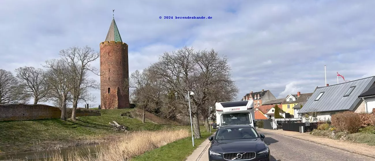 Nach Morgenrunde, Frühstück und Hausputz geht es Richtung Vordingborg, natürlich ohne Autobahnen. Dort angekommen bekommen wir gleich neben dem Wahrzeichen, dem Gänseturm, einen Parkplatz. Das geht bestimmt nur in der Vorsaison. Wir machen ein kurzes Kulturprogramm und umrunden den Gänseturm mitsamt der alten Stadtmauer. Dann fahren wir auf die Insel Møn. Unser Nachtlager schlagen wir im Hafen von Bogø (Bogø By, 593 Grønsundvej) auf. Da die eigentlichen Stellplätze mit Booten belegt sind, stehen wir direkt am Kai. Bei Sonnenschein ein super Platz. Wie häufig in Häfen ist das Sanitär alt, aber sauber. Die Nacht kostet uns inklusive Strom 100 DKK, also etwa 13,50 €. Das Highlight der Tour ist der Sonnenuntergang am Kai und der Mondaufgang zur gegenüberliegenden Seite. Auf dem Gelände gibt es auch eine Bäckerei. Leider hat diese noch geschlossen.