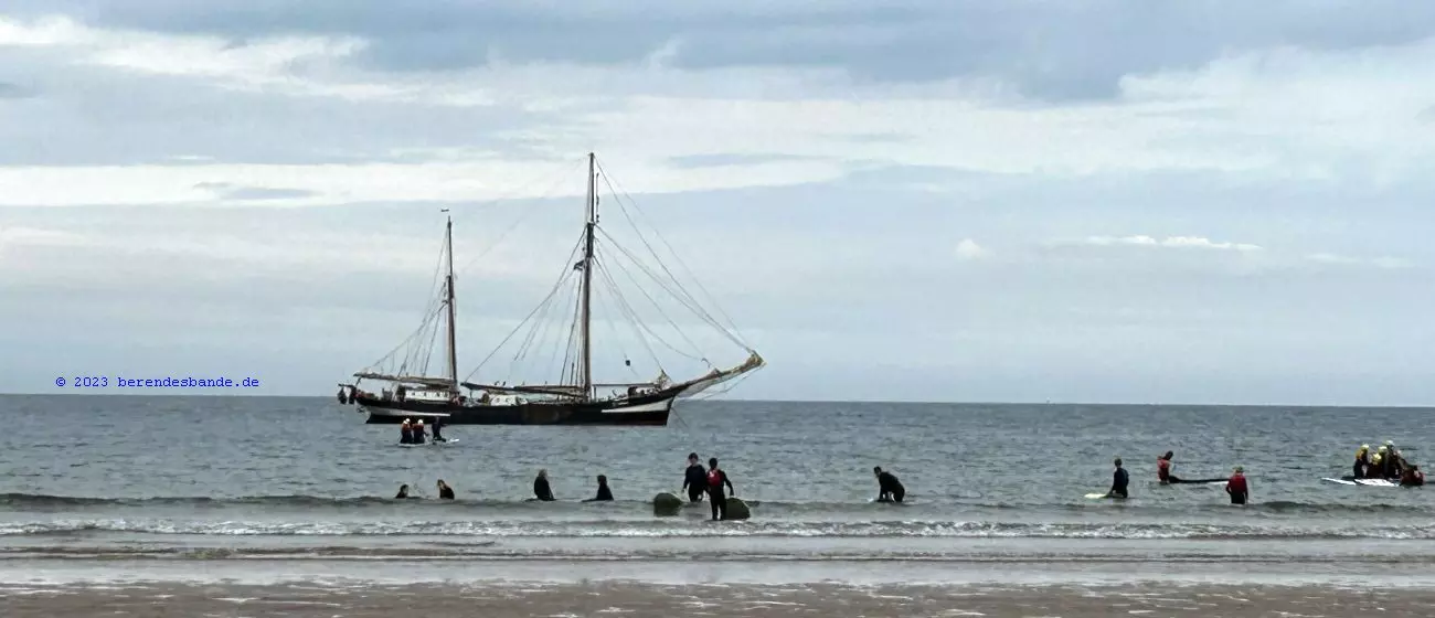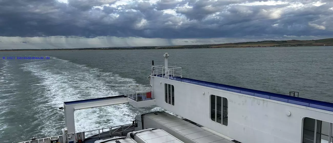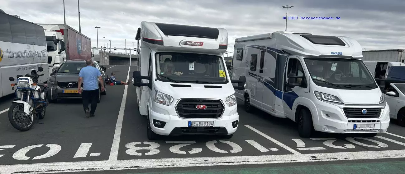 Der Weg zum Strand ist ein schöner Spaziergang für Mensch und Hund und so vertreiben wir uns die Zeit, bis wir am Dienstagnachmittag die letzten 25 km zum Fähranleger fahren. Mit zwei Stunden Pufferzeit läuft alles reibungslos, Checkin bei P&O Ferries mit Kontrolle der Hunde-ID-Chips, die Passkontrolle der Franzosen und die Passkontrolle der Briten. Der nette Herr vom UK Border Control schafft es noch unsere Vornamen halbwegs verständlich auszusprechen, bei Anjas Doppelnachnamen gibt er nach der Hälfte auf und wünscht uns schöne Ferien. Dann warten wir wieder...
