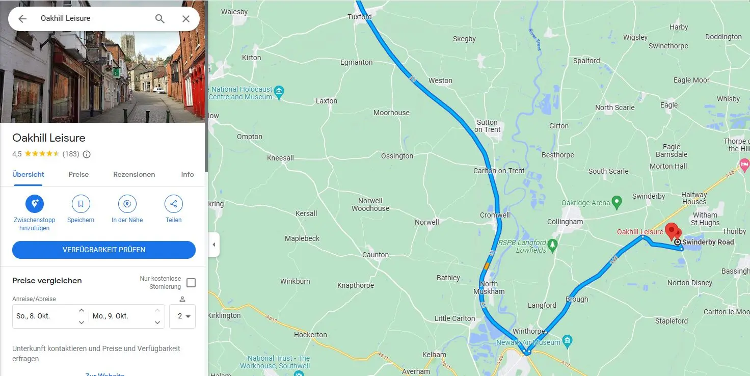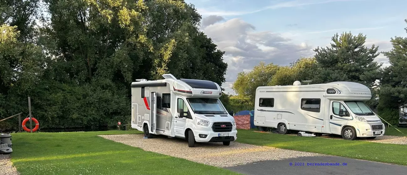 Snickers erträgt mit stoischer Ruhe den Verbandswechsel. Auch den neuen Verband nagt er nicht an. Wir starten Richtung Scarborough und weiter Richtung Kingston. Wir passieren die Humber-Bridge, die mit einer Mittelspannweite von 1410 m eine der längsten Hängebrücken in England ist. Nach mehreren erfolglosen Versuchen landen wir schließlich bei Oakhill Leisure in der Nähe von Lincoln. Es gibt noch genügend Stellplätze. Die Nacht kostet 32 Pfund inklusive Strom. Das Sanitär ist erste Klasse. Es gibt einen Angelteich und genügend Raum für die Hunde, sogar eine Freilaufzone. Die Sonne lacht bei 22 Grad und Mensch und Hund freut es.