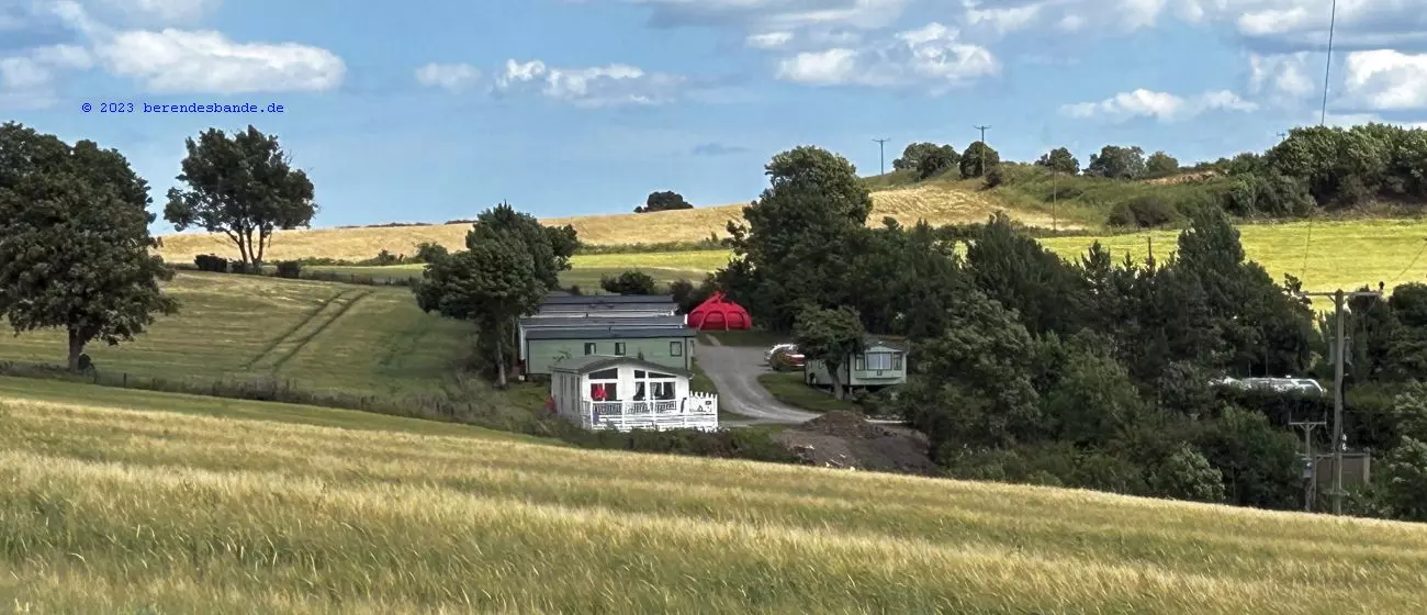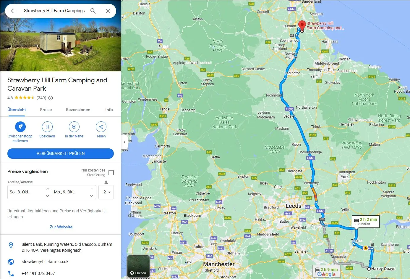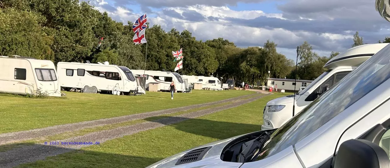 Am Mittwochmorgen geht es weiter Richtung Norden, zuerst Richtung London. Hier erleben wir unseren ersten Stau, der uns mindestens 30 Minuten und jede Menge Nerven kostet. Wir fahren die M1 (The North) und bleiben über Nacht in Misterton bei Haxey Quays, etwas außerhalb von Sheffield. Die Nacht kostet uns 22 Pfund. Der Camping Park ist sehr gut gepflegt, die Parzellen sind groß, nur das Sanitär wird der Größe des Platzes nicht gerecht. Wir schenken uns die Benutzung der einzigen Dusche und fahren am Donnerstag weiter Richtung Norden. Unser Nachtquartier schlagen wir bei Strawberry Hill Farm Camping & Caravan Park auf. Der Platz liegt an einem Hügel in unmittelbarer Nähe einer befahrenen Straße. Der Platz ist familiär geführt und gut gepflegt. Das Waschhaus ist alt, aber sehr sauber. Ein neues Gebäude befindet sich im Bau. Hier ist Duschen kein Problem und die Hunderunden auch nicht. Auch hier führen die Wanderwege durch die Kornfelder. Wir genießen es, in der Sonne zu sitzen und zu relaxen, auch wenn es nur 21 Grad warm ist. Im Preis von 28 Pfund ist alles enthalten. Der Besuch des Tea Room ist zu empfehlen. Es gibt hausgebackenen Kuchen.