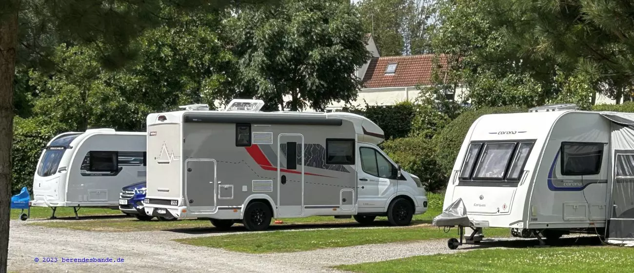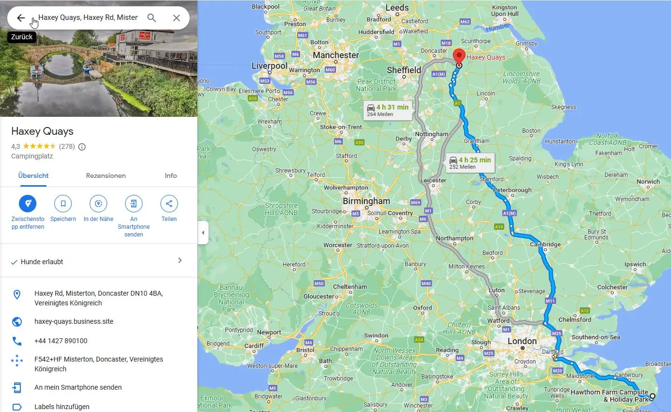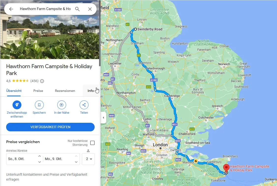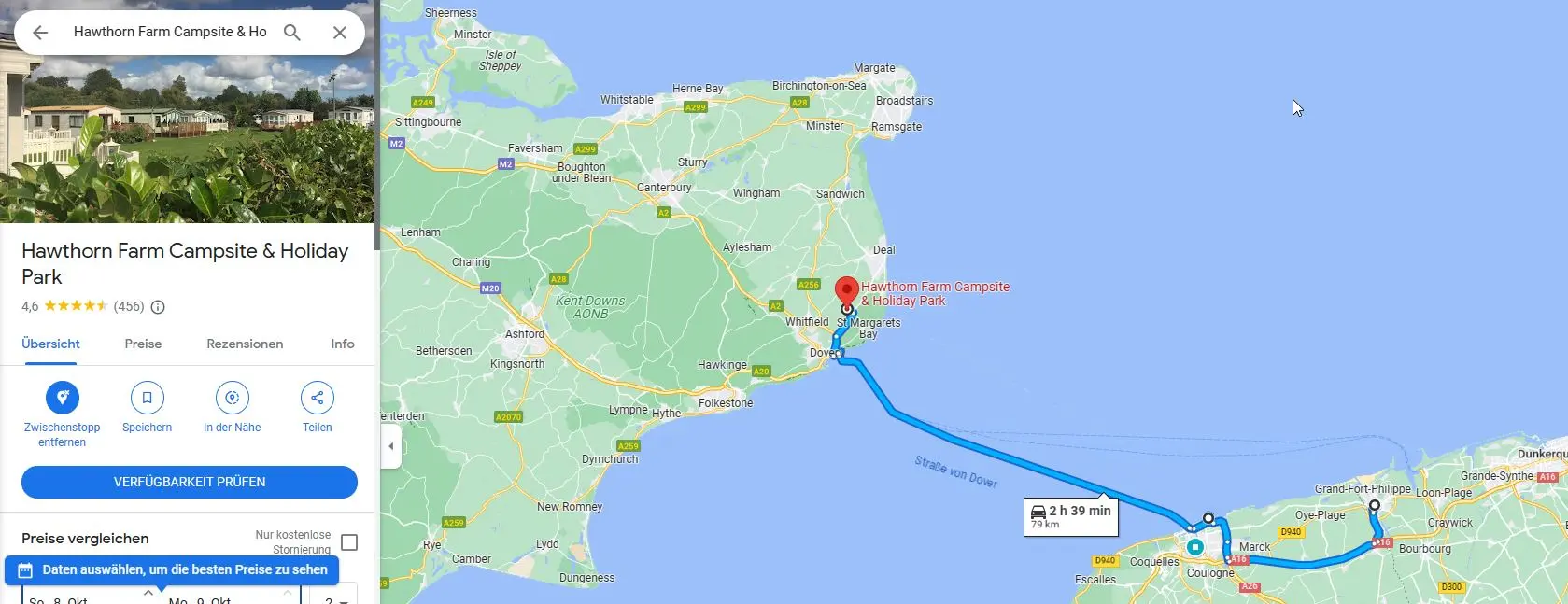 Nach der Morgenroutine und dem Verbandwechsel bei Snickers machen wir uns auf den Weg nach Dover. Wir fahren auf die A1 Richtung Süden und kommen ohne nennenswerte Staus an London vorbei. Wir haben einen Platz reserviert bei Hawthorn Farm Camping. Dort haben wir nach der Ankunft in Dover, am Beginn unserer Reise, bereits eine Nacht verbracht. Diesmal treffen wir vor Büroschluss ein und bekommen einen Stellplatz auf Schotter. Es gießt wie aus Eimern. Zum Glück hört es nach kurzer Zeit auf zu regnen. So können wir noch eine Runde im trockenen über den Platz schlendern. Der Platz ist deutlich größer als erwartet. Also sollte man eigentlich immer einen freien Stellplatz finden. Es empfiehlt sich anzurufen, dann bekommt man den Code für die Schranke und braucht nicht auf den Platz für Spätankömmlinge.