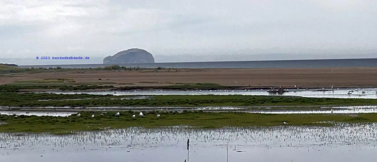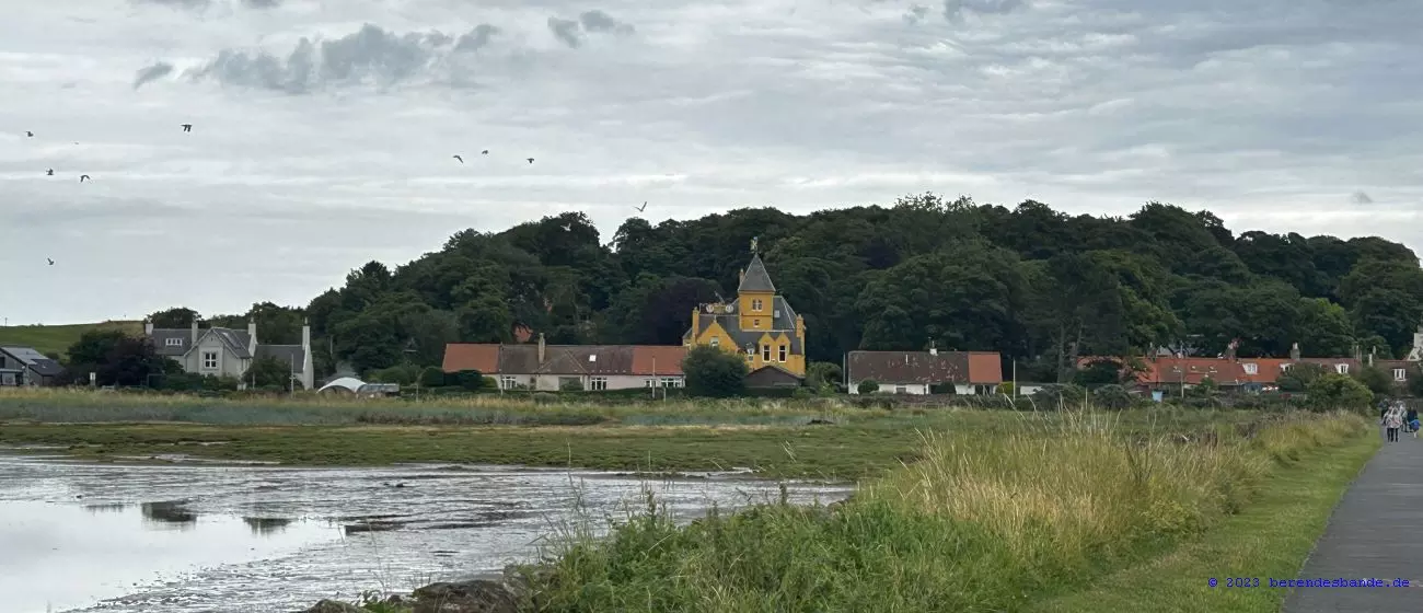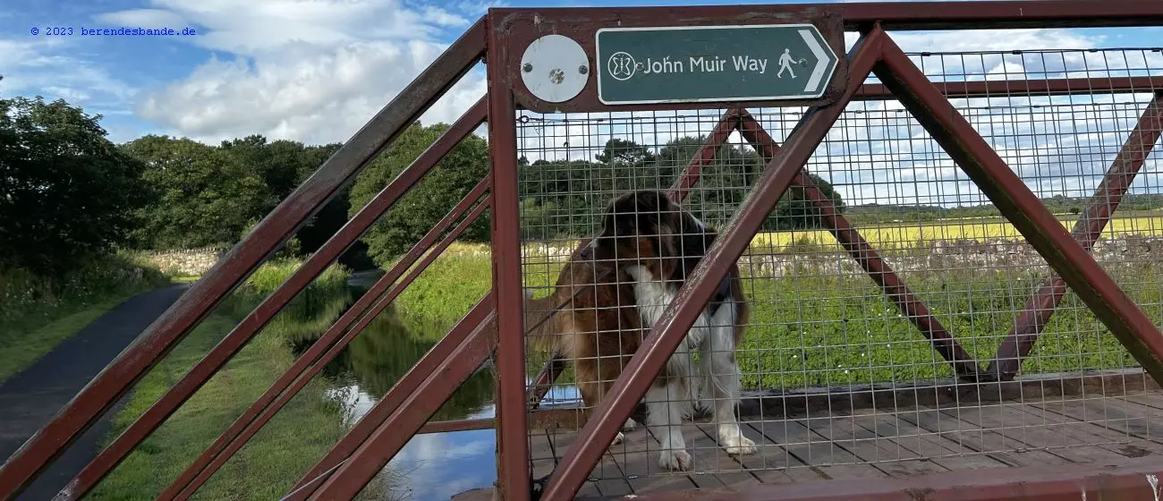 Nach Gassirunde, Frühstück und Reinemachen geht es weiter Richtung Edinburgh. Wir fahren zurück auf die A1 Richtung Norden. Nach etwa 1,5 Stunden Fahrt kommen wir in Schottland an und die Landschaft ändert sich. Sie ist nun felsiger und man kann endlich das Meer sehen. Wir versuchen, an zwei kleinen Campingplätzen in Dunbar, direkt an der Nordseeküste und kurz vor Edinburgh gelegen, einen Stellplatz zu bekommen. Leider bleibt dieses Unterfangen erfolglos, so fahren wir Belhaven Bay Park in Dunbar an und checken für eine Nacht ein. Der Platz ist super gepflegt, hat ein modernes, sauberes Sanitär. Mit 38 Pfund sind wir dabei. Es gibt genügend Auslaufmöglichkeiten für unsere Fellnasen. John Muir ist ein bekannter Naturschützer, der in Dunbar geboren wurde. Im Gebiet der Salzwiesen, zwischen Strand und Campingplatz, verläuft der John Muir Way, wo wir unsere Aussies auch mal ohne Leine ausführen können. Leider beginnt es am Abend zu regnen, aber zuvor nutzten wir die Gelegenheit zu einem ausgiebigen Spaziergang am Strand.